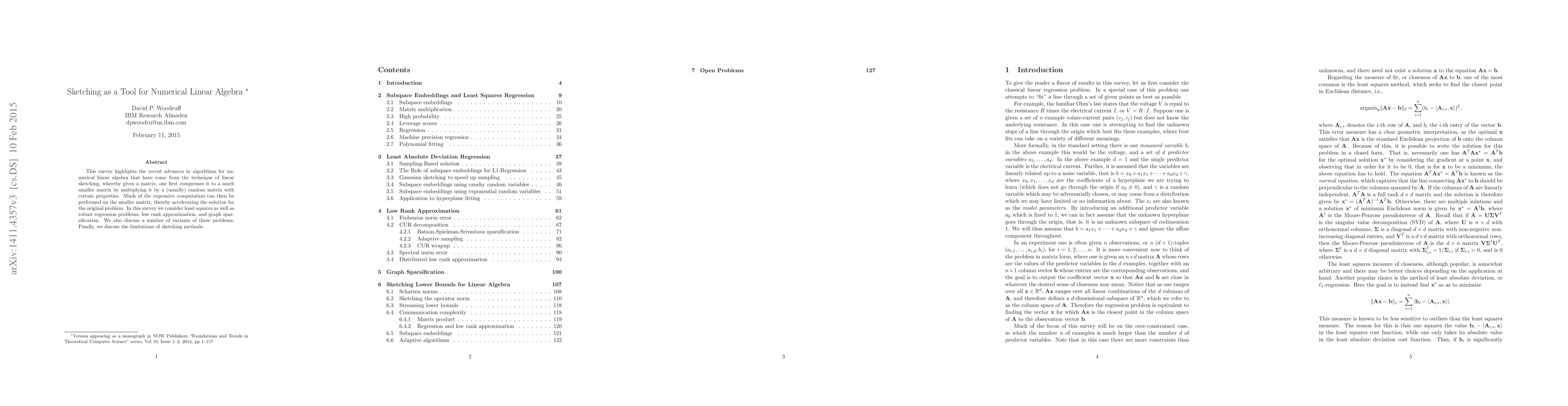 This survey highlights the recent advances in algorithms for numerical linear algebra that have come from the technique of linear sketching, whereby given a matrix, one first compresses it to a much smaller matrix by multiplying it by a (usually) random matrix with certain properties. Much of the expensive computation can then be performed on the smaller matrix, thereby accelerating the solution for the original problem. In this survey we consider least squares as well as robust regression problems, low rank approximation, and graph sparsification. We also discuss a number of variants of these problems. Finally, we discuss the limitations of sketching methods.