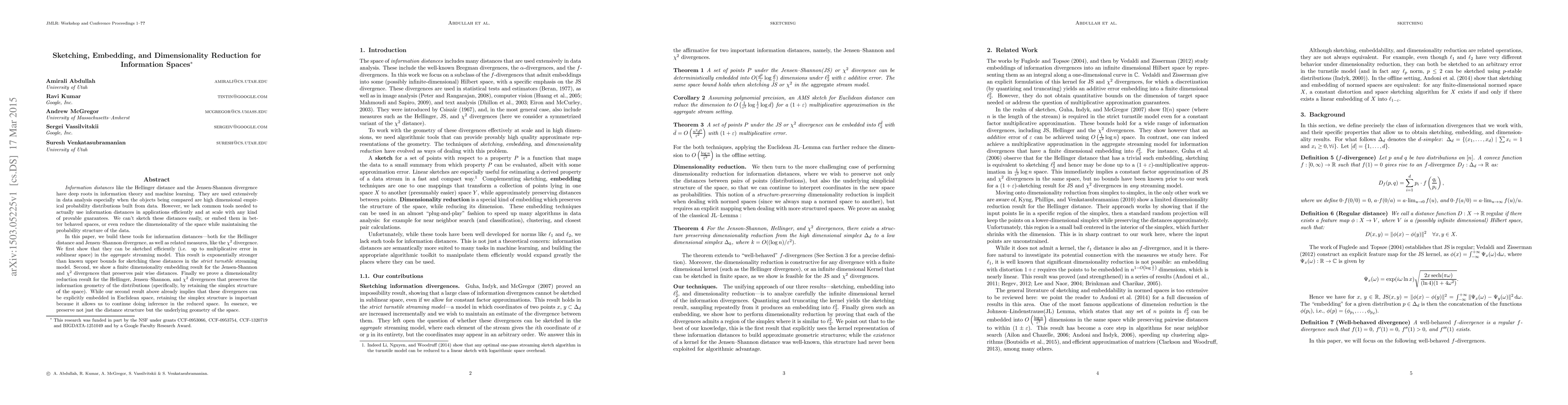 This paper develops tools for efficiently handling information distances like the Hellinger distance and Jensen-Shannon divergence in high-dimensional spaces. It introduces efficient sketching, embedding, and dimensionality reduction techniques that maintain the probability structure and geometry of the data distributions.