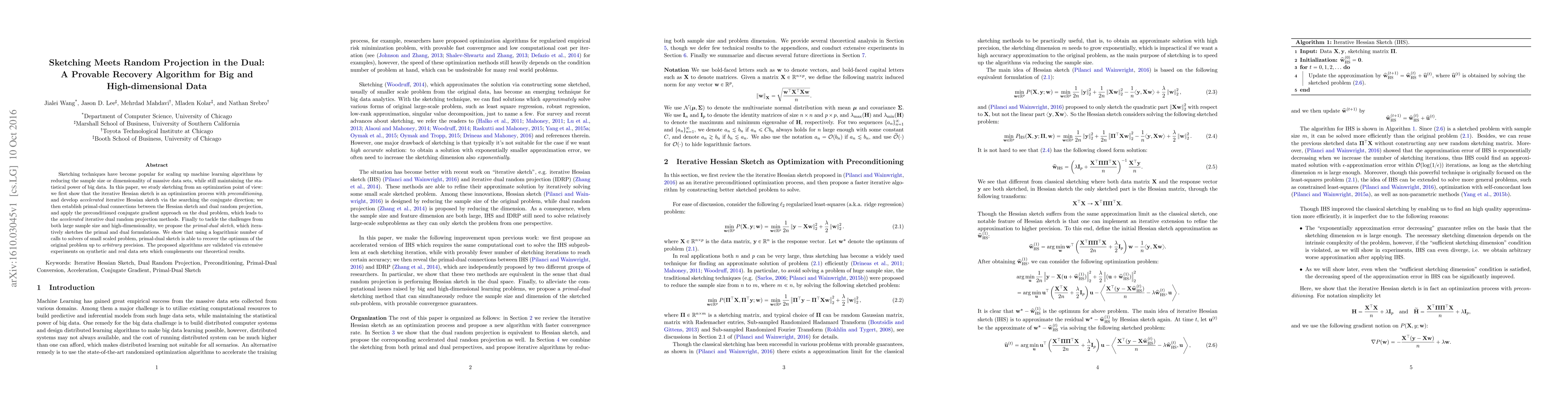 Sketching techniques have become popular for scaling up machine learning algorithms by reducing the sample size or dimensionality of massive data sets, while still maintaining the statistical power of big data. In this paper, we study sketching from an optimization point of view: we first show that the iterative Hessian sketch is an optimization process with preconditioning, and develop accelerated iterative Hessian sketch via the searching the conjugate direction; we then establish primal-dual connections between the Hessian sketch and dual random projection, and apply the preconditioned conjugate gradient approach on the dual problem, which leads to the accelerated iterative dual random projection methods. Finally to tackle the challenges from both large sample size and high-dimensionality, we propose the primal-dual sketch, which iteratively sketches the primal and dual formulations. We show that using a logarithmic number of calls to solvers of small scale problem, primal-dual sketch is able to recover the optimum of the original problem up to arbitrary precision. The proposed algorithms are validated via extensive experiments on synthetic and real data sets which complements our theoretical results.