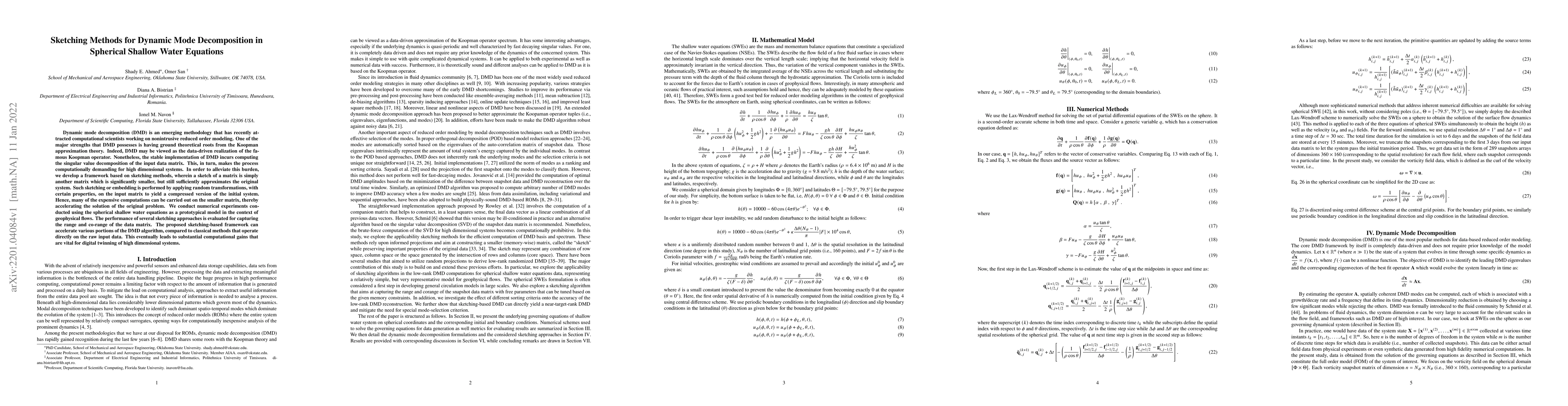 This paper proposes a framework using sketching methods to accelerate dynamic mode decomposition in spherical shallow water equations, leading to substantial computational gains for digital twinning of high-dimensional systems.