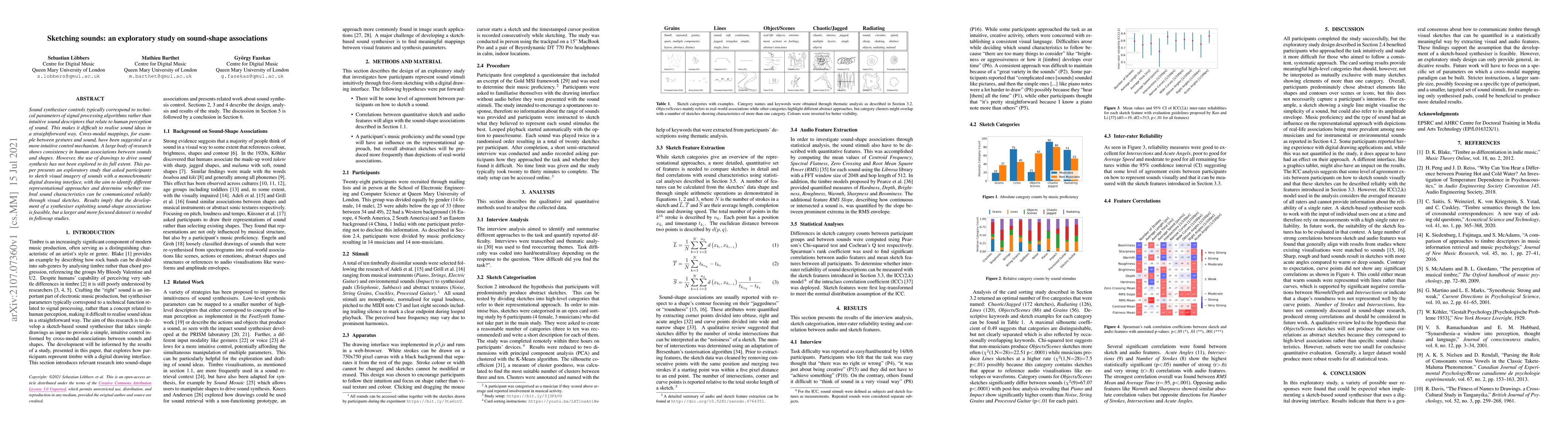 This study explores how visual sketches can represent sound characteristics, finding that participants' drawings correlate with timbral sound features. While promising, further research is needed to develop a sound synthesiser based on these sound-shape associations.