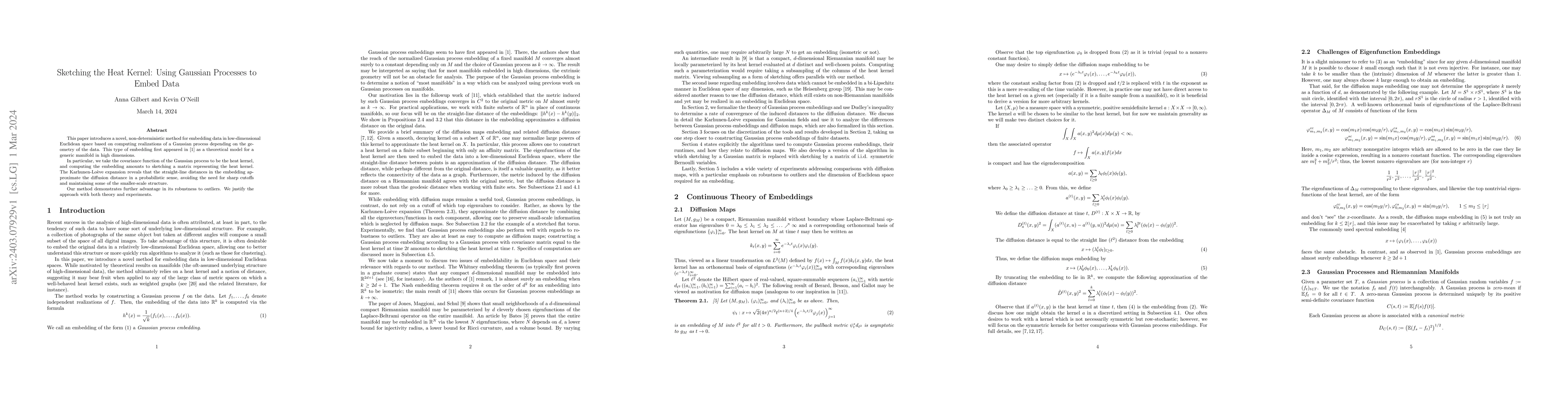 This paper introduces a novel, non-deterministic method for embedding data in low-dimensional Euclidean space based on computing realizations of a Gaussian process depending on the geometry of the data. This type of embedding first appeared in (Adler et al, 2018) as a theoretical model for a generic manifold in high dimensions. In particular, we take the covariance function of the Gaussian process to be the heat kernel, and computing the embedding amounts to sketching a matrix representing the heat kernel. The Karhunen-Lo\`eve expansion reveals that the straight-line distances in the embedding approximate the diffusion distance in a probabilistic sense, avoiding the need for sharp cutoffs and maintaining some of the smaller-scale structure. Our method demonstrates further advantage in its robustness to outliers. We justify the approach with both theory and experiments.