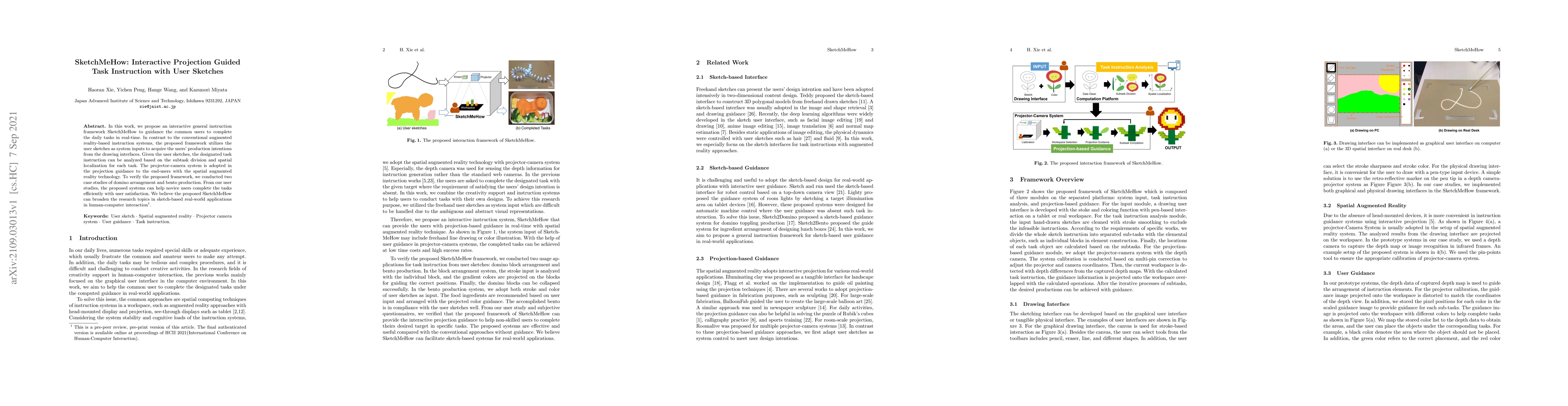Title: SketchMeHow: Interactive Projection Guided Task Instruction with User Sketches Summary: This paper introduces SketchMeHow, a framework that uses user-drawn sketches to provide real-time task guidance, employing spatial augmented reality for effective instruction and user satisfaction, validated through domino arrangement and bento production case studies.