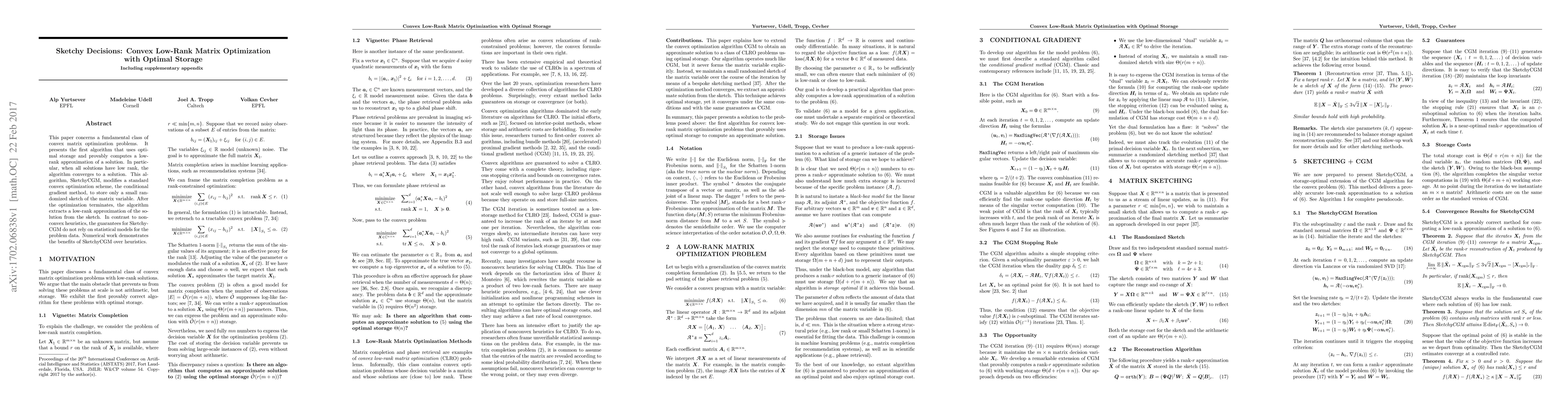 Researchers developed an algorithm called SketchyCGM that optimizes convex matrix problems with low storage requirements, achieving a low-rank approximation of the solution.