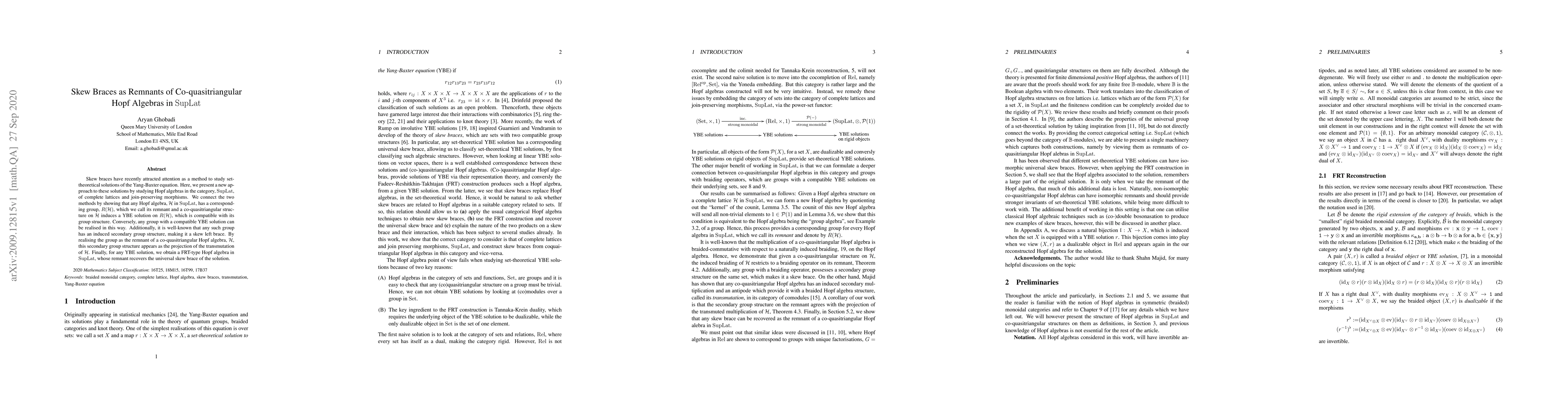 Skew braces have recently attracted attention as a method to study set-theoretical solutions of the Yang-Baxter equation. Here, we present a new approach to these solutions by studying Hopf algebras in the category, $\mathrm{SupLat}$, of complete lattices and join-preserving morphisms. We connect the two methods by showing that any Hopf algebra, $\mathcal{H}$ in $\mathrm{SupLat}$, has a corresponding group, $R(\mathcal{H})$, which we call its remnant and a co-quasitriangular structure on $\mathcal{H}$ induces a YBE solution on $R(\mathcal{H})$, which is compatible with its group structure. Conversely, any group with a compatible YBE solution can be realised in this way. Additionally, it is well-known that any such group has an induced secondary group structure, making it a skew left brace. By realising the group as the remnant of a co-quasitriangular Hopf algebra, $\mathcal{H}$, this secondary group structure appears as the projection of the transmutation of $\mathcal{H}$. Finally, for any YBE solution, we obtain a FRT-type Hopf algebra in $\mathrm{SupLat}$, whose remnant recovers the universal skew brace of the solution.