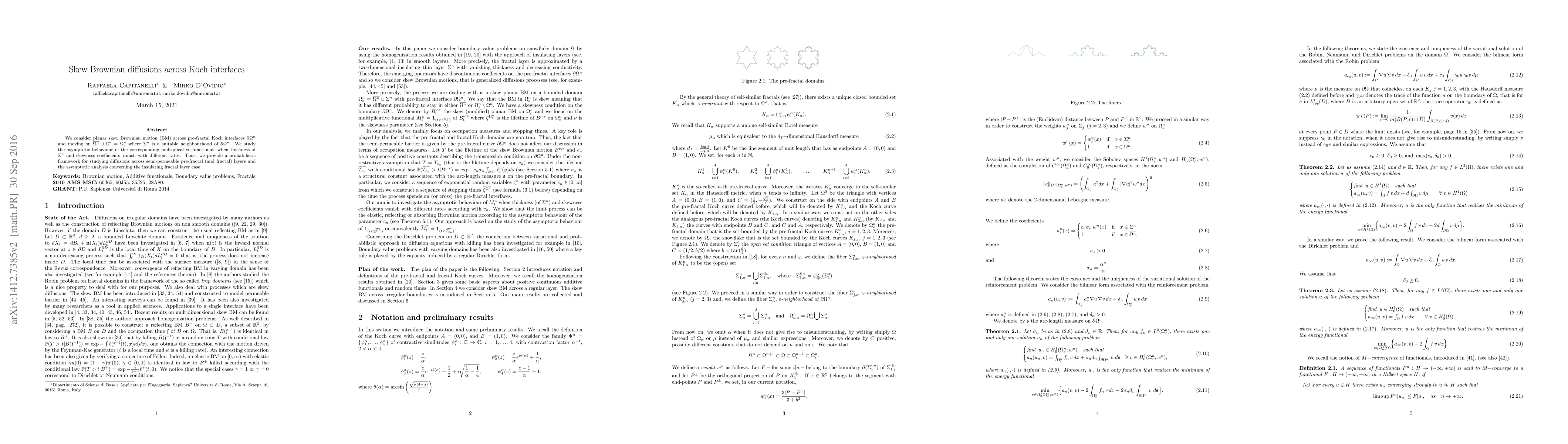 This paper investigates the behavior of skew Brownian motion as it traverses Koch interfaces, focusing on the asymptotic properties of multiplicative additive functionals when the interface thickness and skewness coefficients tend to zero at different rates. The study provides insights into the dynamics of such diffusions across fractal boundaries.