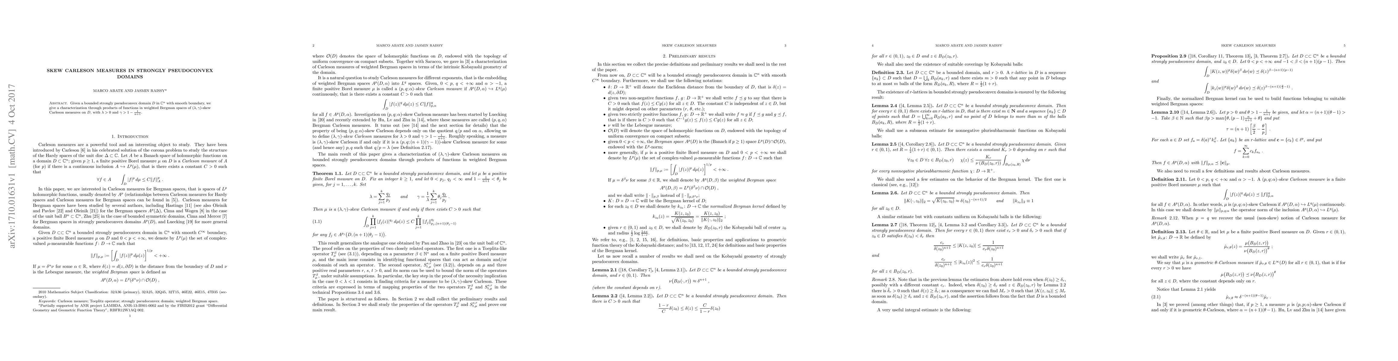 Given a bounded strongly pseudoconvex domain $D$ in $\mathbb{C}^n$ with smooth boundary, we give a characterization through products of functions in weighted Bergman spaces of $(\lambda,\gamma)$-skew Carleson measures on $D$, with $\lambda>0$ and $\gamma>1-\frac{1}{n+1}$.