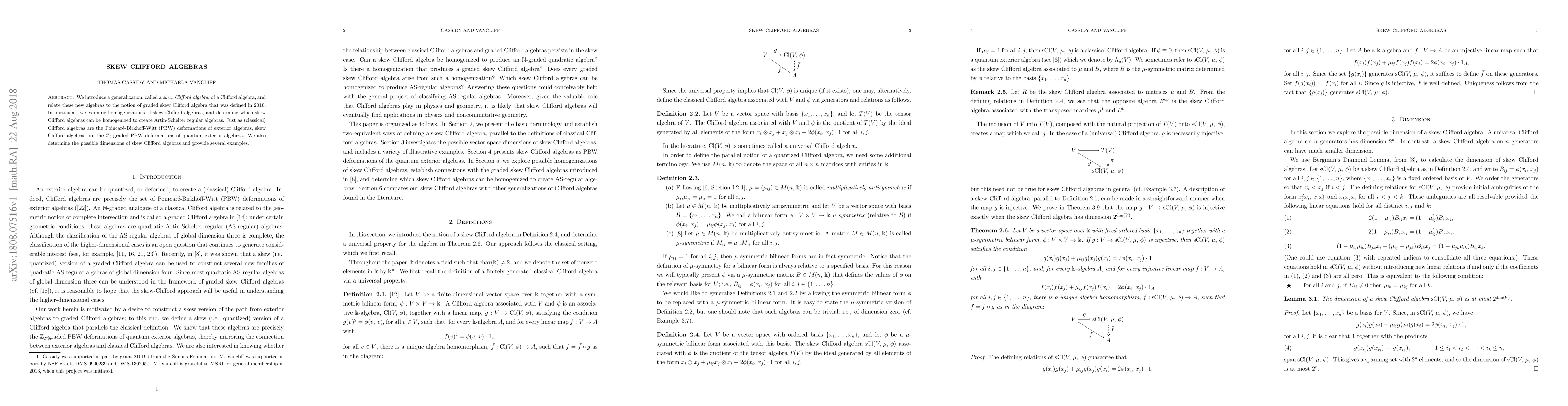 Summary: The paper generalizes Clifford algebras into skew Clifford algebras and explores their homogenization to Artin-Schelter regular algebras, establishing a $\mathbb{Z}_2$-graded PBW deformation link to quantum exterior algebras and detailing their dimensions and examples.