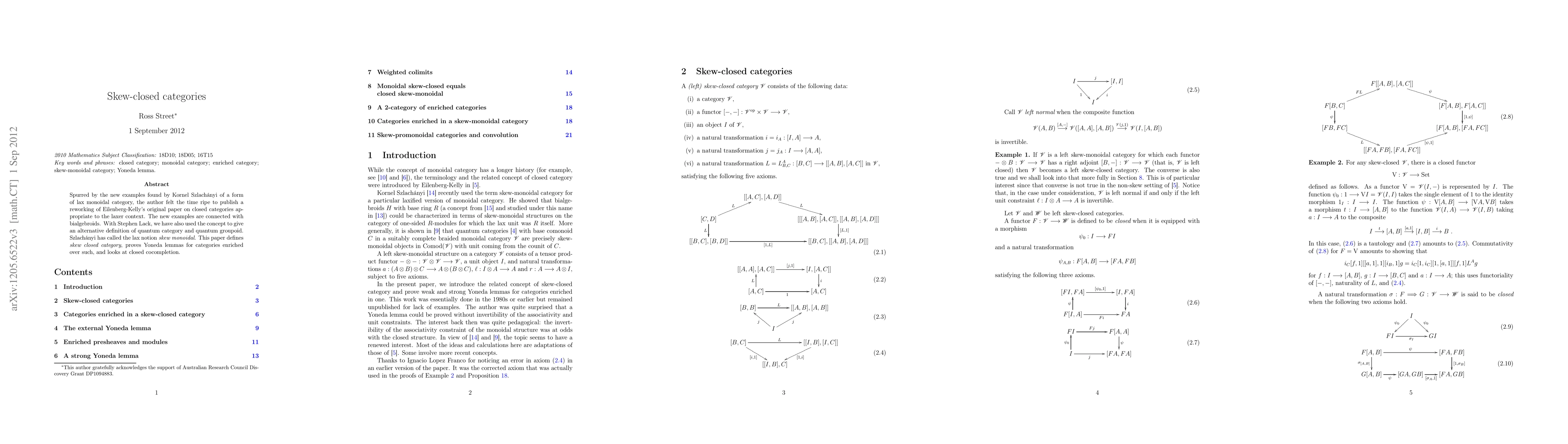 Spurred by the new examples found by Kornel Szlach\'anyi of a form of lax monoidal category, the author felt the time ripe to publish a reworking of Eilenberg-Kelly's original paper on closed categories appropriate to the laxer context. The new examples are connected with bialgebroids. With Stephen Lack, we have also used the concept to give an alternative definition of quantum category and quantum groupoid. Szlach\'anyi has called the lax notion {\em skew monoidal}. This paper defines {\em skew closed category}, proves Yoneda lemmas for categories enriched over such, and looks at closed cocompletion.