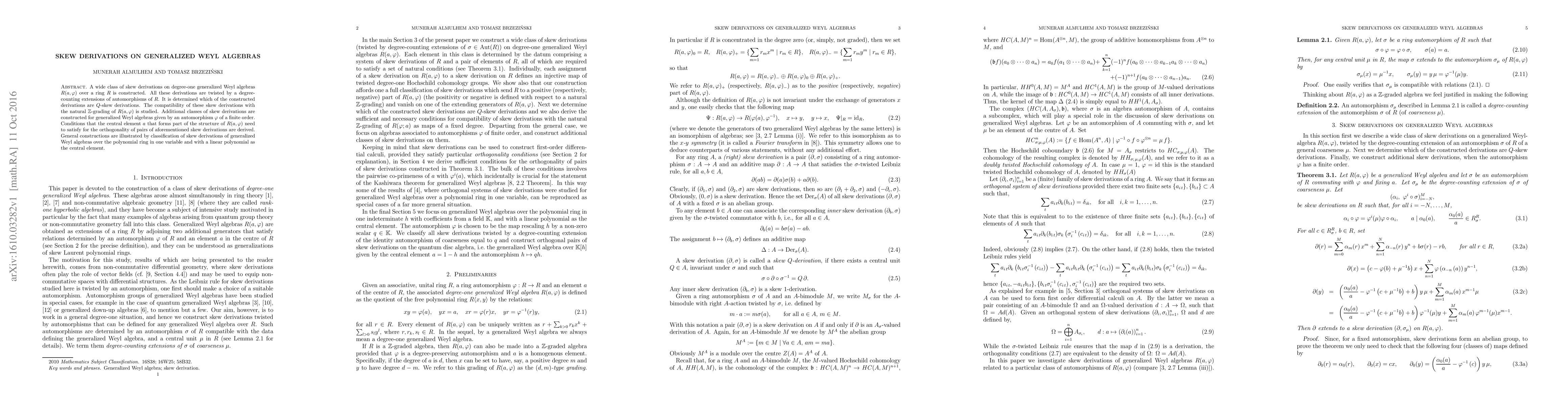 This paper constructs a broad class of skew derivations on generalized Weyl algebras $R(a,\varphi)$ and explores their compatibility with the natural ${\mathbb Z}$-grading. It determines conditions for these skew derivations to be $Q$-skew and investigates orthogonality conditions for the central element $a$.