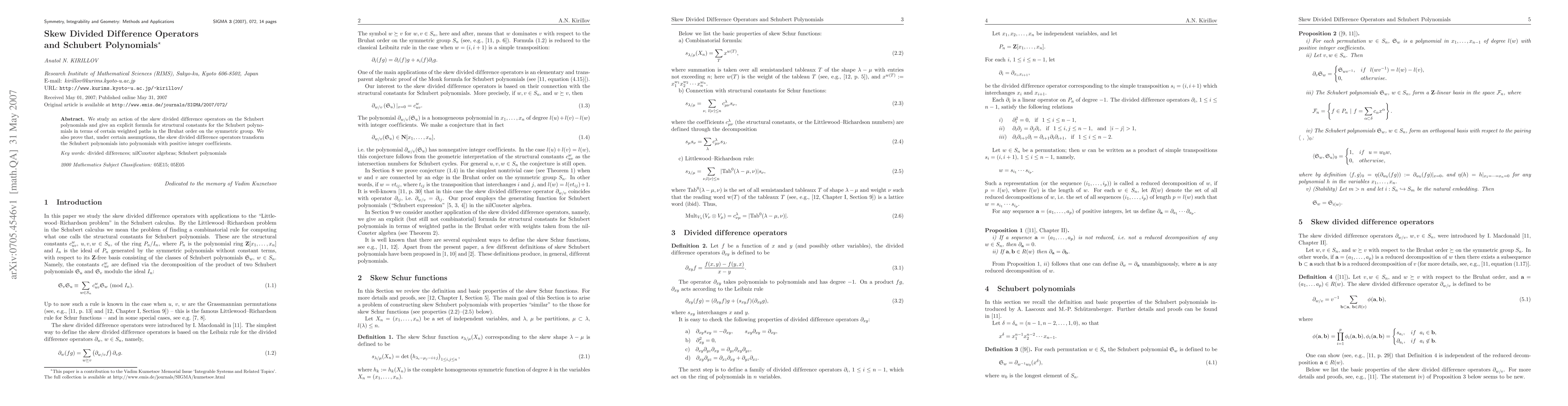 Researchers study the action of skew divided difference operators on Schubert polynomials, providing a formula for structural constants in terms of weighted paths in the Bruhat order. They also prove that these operators transform Schubert polynomials into those with positive integer coefficients under certain assumptions.