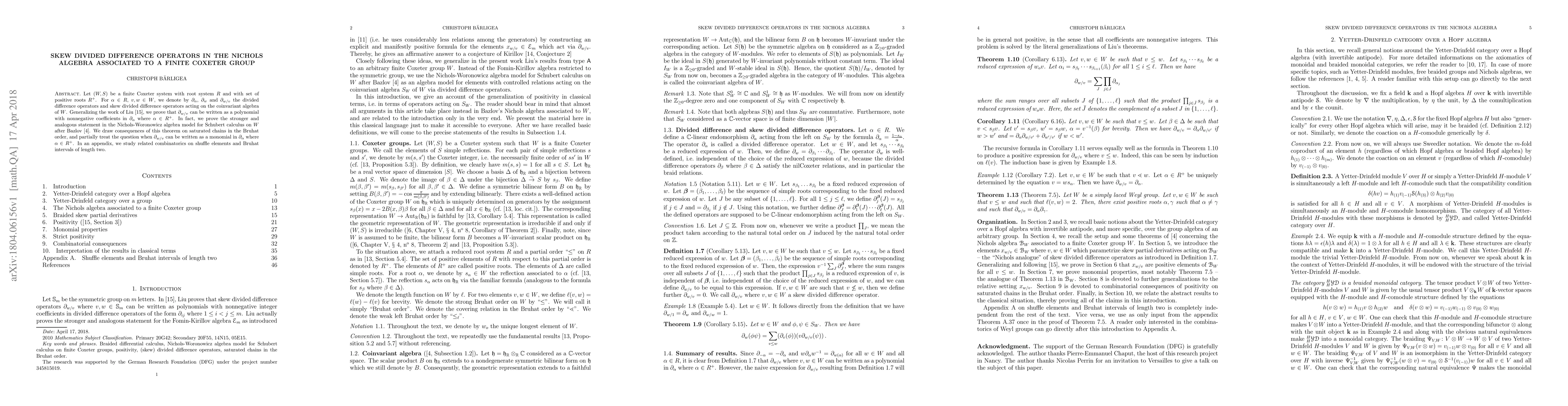 Let $(W,S)$ be a finite Coxeter system with root system $R$ and with set of positive roots $R^+$. For $\alpha\in R$, $v,w\in W$, we denote by $\partial_\alpha$, $\partial_w$ and $\partial_{w/v}$ the divided difference operators and skew divided difference operators acting on the coinvariant algebra of $W$. Generalizing the work of Liu, we prove that $\partial_{w/v}$ can be written as a polynomial with nonnegative coefficients in $\partial_\alpha$ where $\alpha\in R^+$. In fact, we prove the stronger and analogous statement in the Nichols-Woronowicz algebra model for Schubert calculus on $W$ after Bazlov. We draw consequences of this theorem on saturated chains in the Bruhat order, and partially treat the question when $\partial_{w/v}$ can be written as a monomial in $\partial_\alpha$ where $\alpha\in R^+$. In an appendix, we study related combinatorics on shuffle elements and Bruhat intervals of length two.