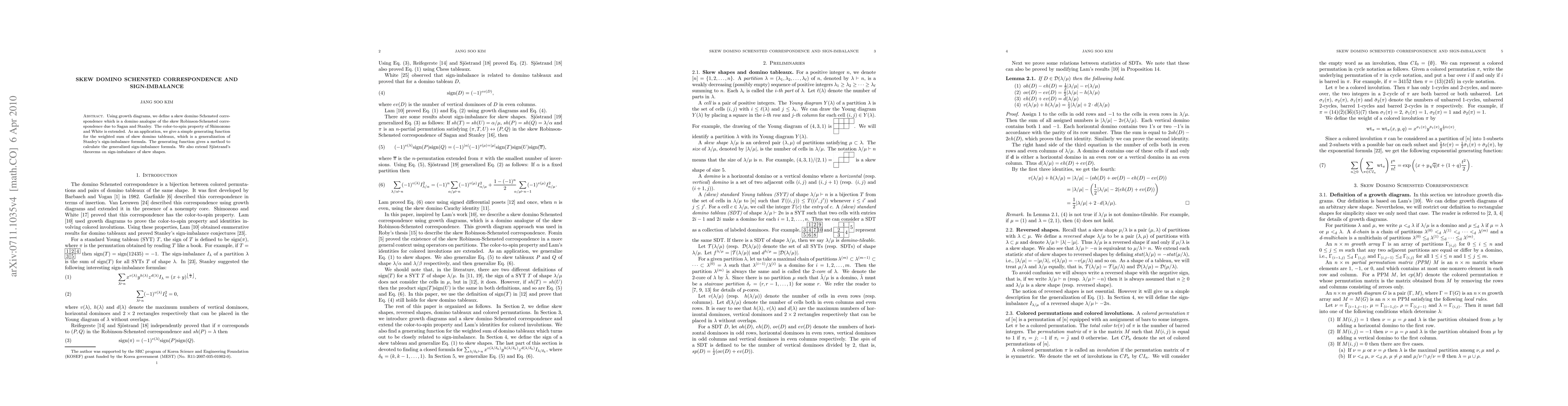 The paper introduces a skew domino Schensted correspondence based on growth diagrams, extending the color-to-spin property, and provides a generating function for weighted skew domino tableaux, which generalizes Stanley's sign-imbalance formula and extends Sj{\"o}strand's sign-imbalance theorems.