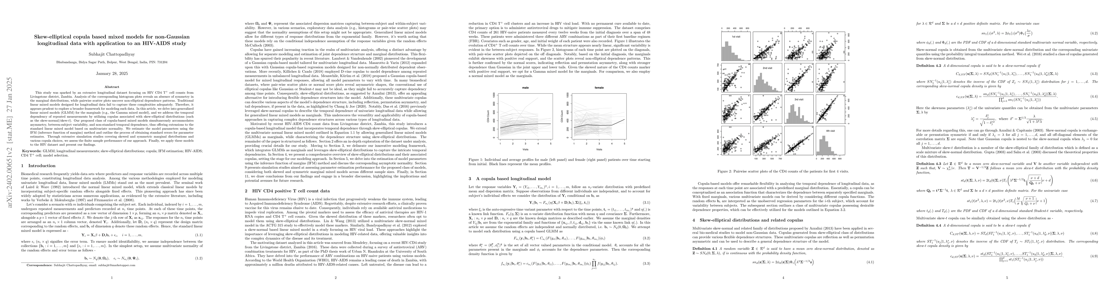 This paper proposes skew-elliptical copula based mixed models for non-Gaussian longitudinal data, addressing asymmetry and non-elliptical dependence in HIV CD4 T+ cell counts. The models are estimated using the IFM method and evaluated through simulations, demonstrating improved performance over standard linear mixed models.
