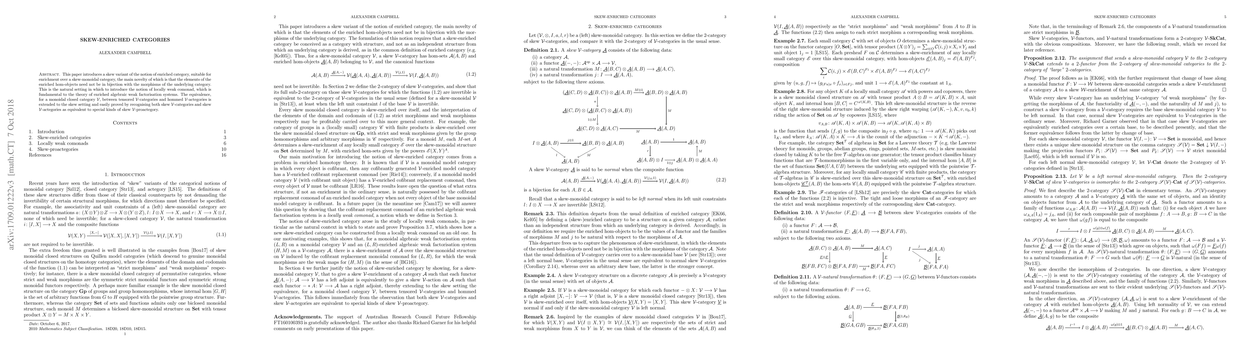 This paper introduces a skew variant of the notion of enriched category, suitable for enrichment over a skew-monoidal category, the main novelty of which is that the elements of the enriched hom-objects need not be in bijection with the morphisms of the underlying category. This is the natural setting in which to introduce the notion of locally weak comonad, which is fundamental to the theory of enriched algebraic weak factorisation systems. The equivalence, for a monoidal closed category $\mathcal{V}$, between tensored $\mathcal{V}$-categories and hommed $\mathcal{V}$-actegories is extended to the skew setting and easily proved by recognising both skew $\mathcal{V}$-categories and skew $\mathcal{V}$-actegories as equivalent to special kinds of skew $\mathcal{V}$-proactegory.