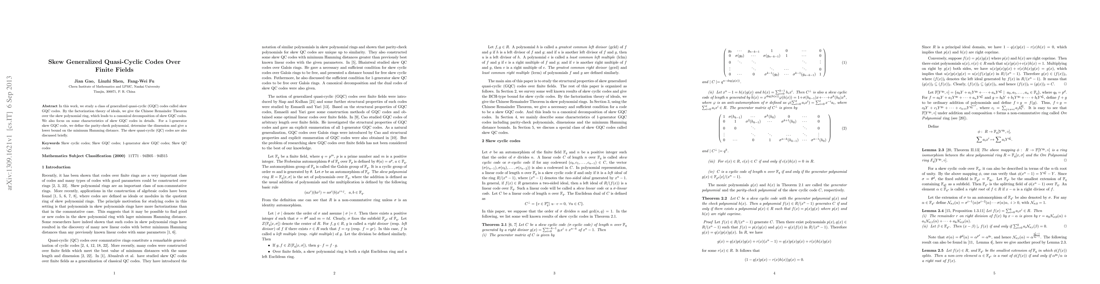 This paper investigates skew generalized quasi-cyclic (skew GQC) codes, providing a Chinese Remainder Theorem for a skew polynomial ring and a canonical decomposition. It also examines the characteristics, dimension, and minimum Hamming distance of 1-generator skew GQC codes, and briefly discusses skew quasi-cyclic codes.