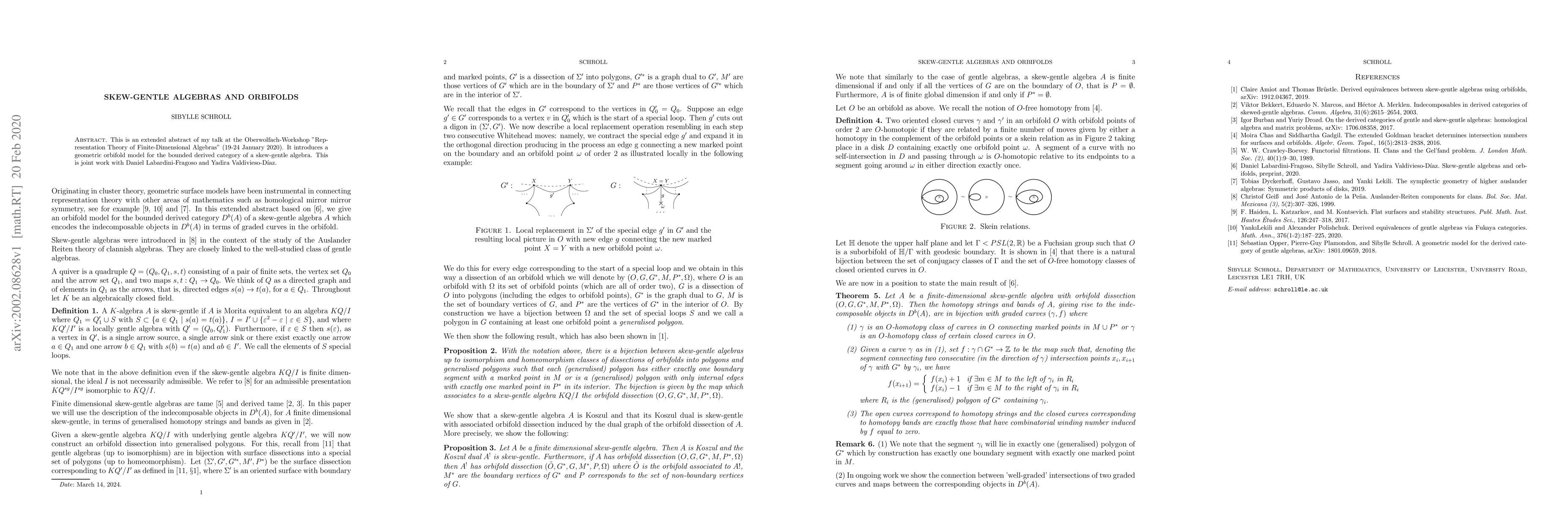 This is an extended abstract of my talk at the Oberwolfach-Workshop "Representation Theory of Finite-Dimensional Algebras" (19-24 January 2020). It introduces a geometric orbifold model for the bounded derived category of a skew-gentle algebra. This is joint work with Daniel Labardini-Fragoso and Yadira Valdivieso-D\'iaz.