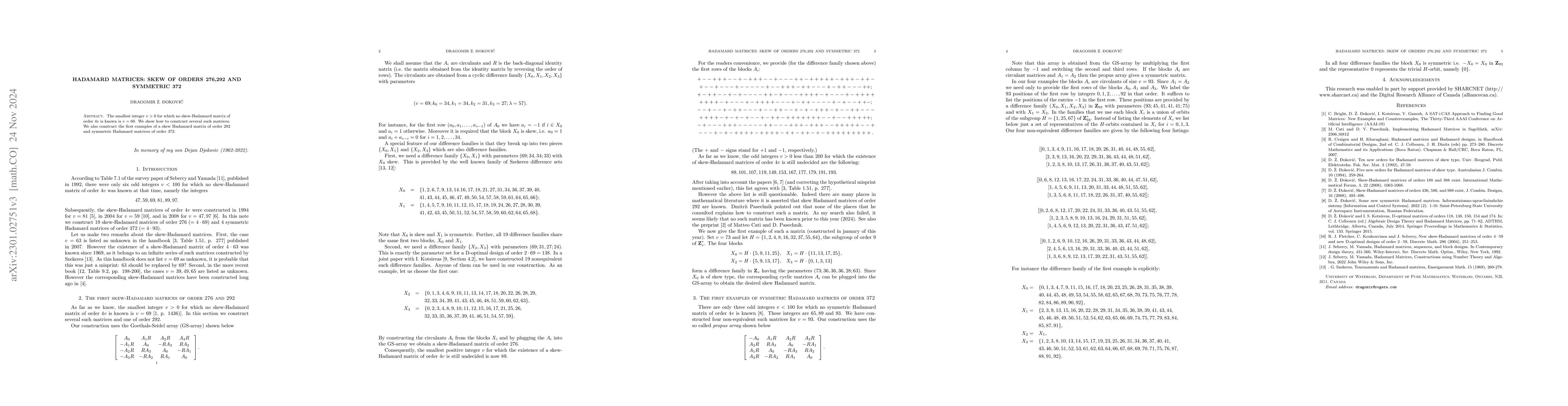 The paper describes the construction of skew-Hadamard matrices of order 276 using circulant matrices derived from cyclic difference families. The authors utilize known Szekeres difference sets and construct 19 nonequivalent difference families for a D-optimal design of order 138.