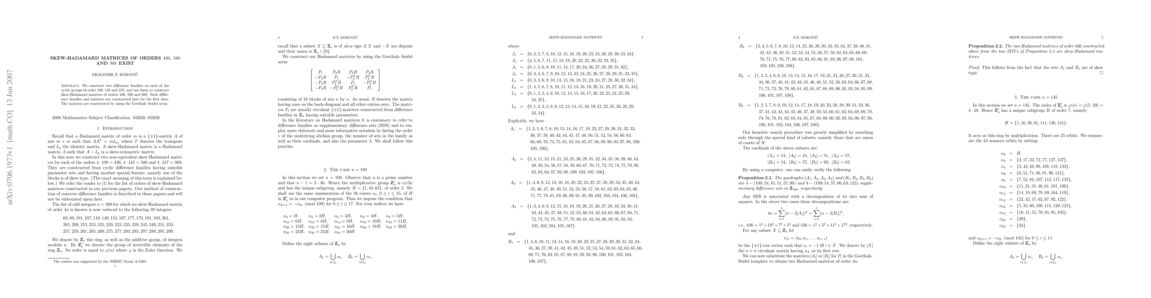 This paper constructs skew-Hadamard matrices of orders 436, 580, and 988 using new difference families on cyclic groups of orders 109, 145, and 247, respectively, for the first time, employing the Goethals-Seidel array method.