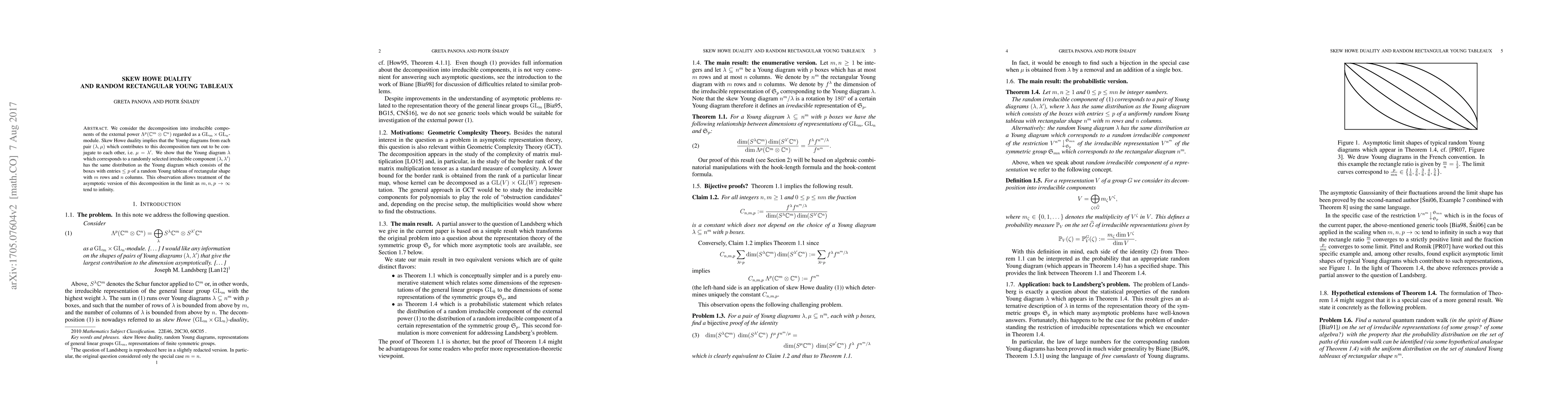 We consider the decomposition into irreducible components of the external power $\Lambda^p(\mathbb{C}^m\otimes \mathbb{C}^n)$ regarded as a $\operatorname{GL}_m\times\operatorname{GL}_n$-module. Skew Howe duality implies that the Young diagrams from each pair $(\lambda,\mu)$ which contributes to this decomposition turn out to be conjugate to each other, i.e.~$\mu=\lambda'$. We show that the Young diagram $\lambda$ which corresponds to a randomly selected irreducible component $(\lambda,\lambda')$ has the same distribution as the Young diagram which consists of the boxes with entries $\leq p$ of a random Young tableau of rectangular shape with $m$ rows and $n$ columns. This observation allows treatment of the asymptotic version of this decomposition in the limit as $m,n,p\to\infty$ tend to infinity.