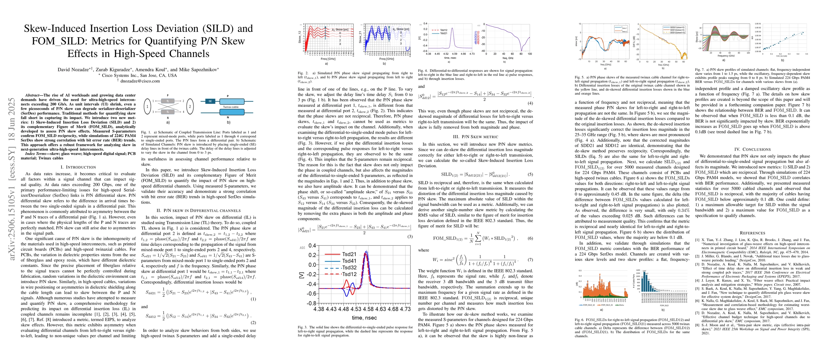 The rise of AI workloads and growing data center demands have driven the need for ultra-high-speed interconnects exceeding 200 Gb/s. As unit intervals (UI) shrink, even a few picoseconds of P/N skew can degrade serializer-deserializer (SerDes) performance. Traditional methods for quantifying skew fall short in capturing its impact. We introduce two new metrics: 1) Skew-Induced Insertion Loss Deviation (SILD) and 2) its complementary Figure of Merit (FOM_SILD), analytically developed to assess P/N skew effects. Measured S-parameters confirm FOM_SILD reciprocity, while simulations of 224G PAM4 SerDes show strong correlation with bit error rate (BER) trends. This approach offers a robust framework for analyzing skew in next-generation ultra-high-speed interconnects.