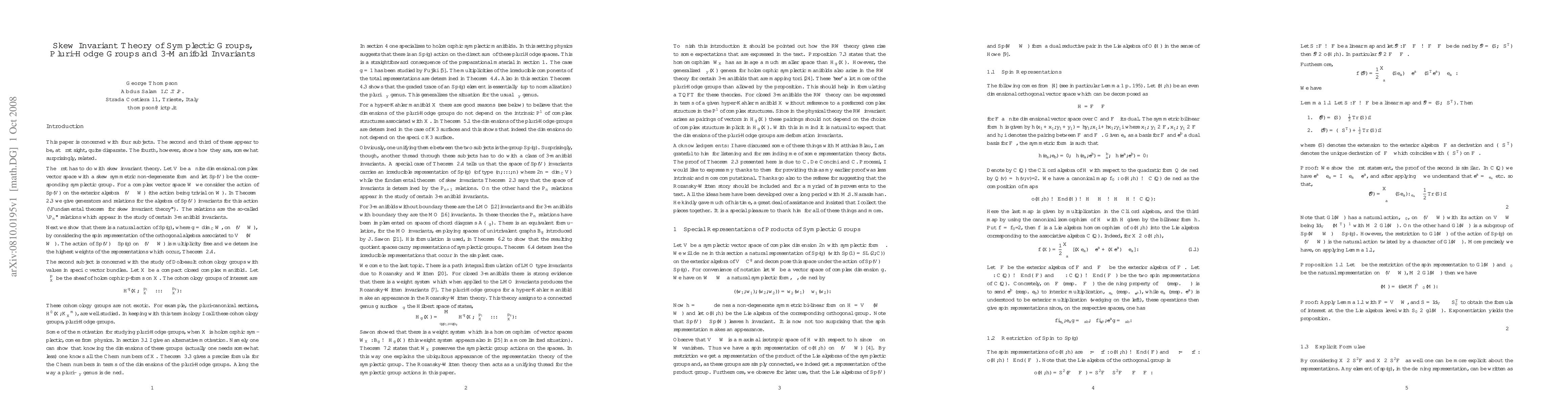 This paper establishes the fundamental theorem of skew invariant theory for symplectic groups and introduces Pluri-Hodge groups, linking them to 3-manifold invariants and providing precise formulae for Chern numbers via Riemann-Roch. It also shows that these groups represent symplectic group actions on spaces of trivalent graphs.
