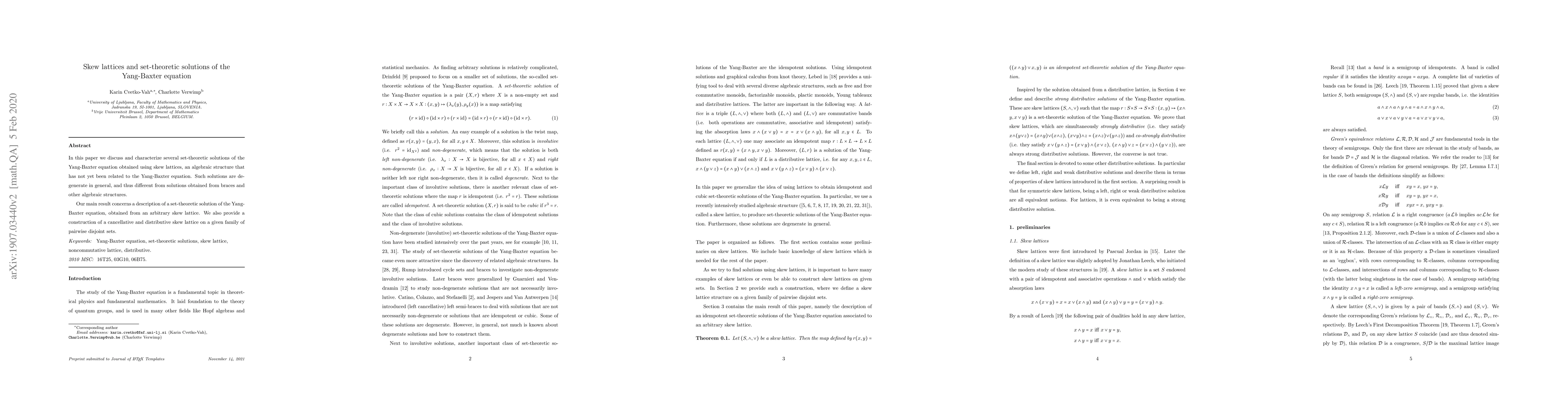 This paper explores set-theoretic solutions of the Yang-Baxter equation derived from skew lattices, an underexplored algebraic structure. It characterizes these solutions, which are typically degenerate, and provides a construction for a cancellative and distributive skew lattice on a family of disjoint sets.