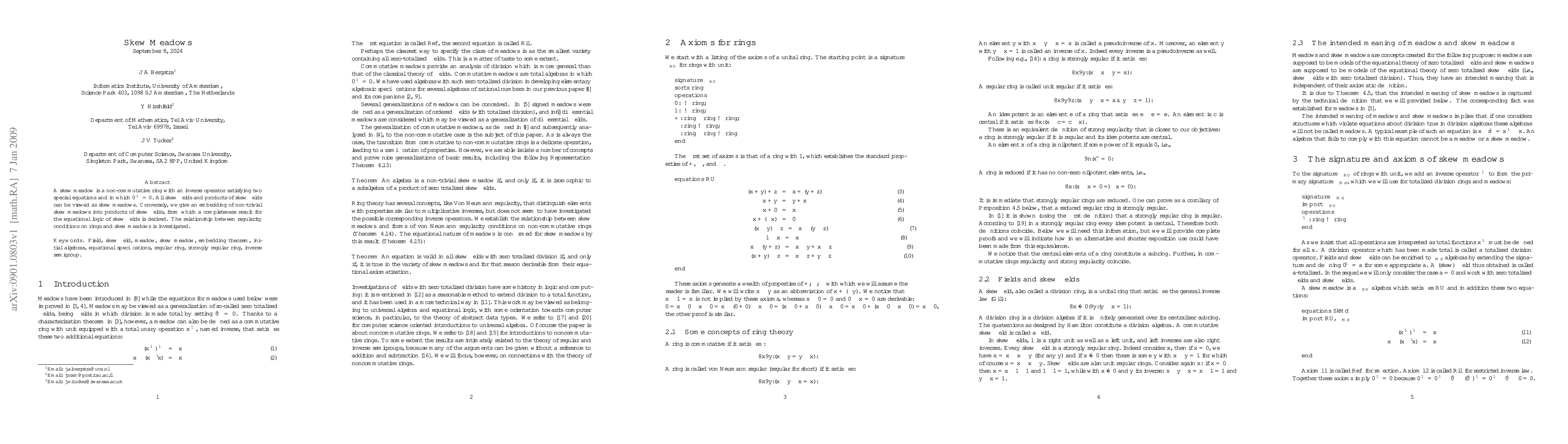 This paper explores skew meadows, a non-commutative ring with unique inverse properties, showing that they encompass skew fields and products of skew fields. It also establishes an embedding of skew meadows into skew fields, leading to a completeness result for their equational logic.
