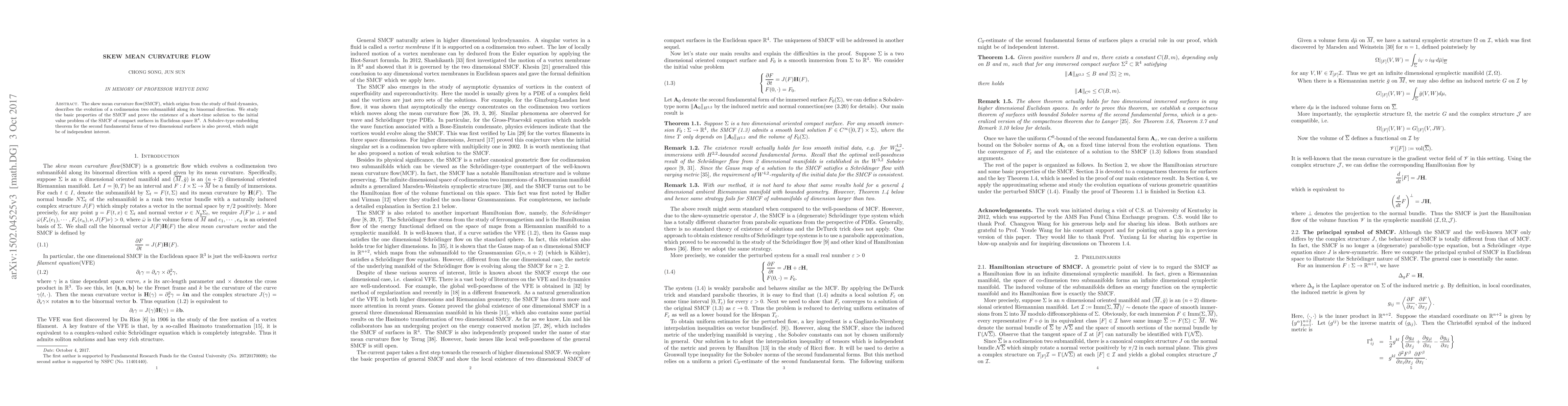 The paper investigates the skew mean curvature flow (SMCF) in fluid dynamics, proving the existence of a short-time solution for compact surfaces in $\mathbb{R}^4$ and establishing a Sobolev-type embedding theorem for the second fundamental forms of two-dimensional surfaces.
