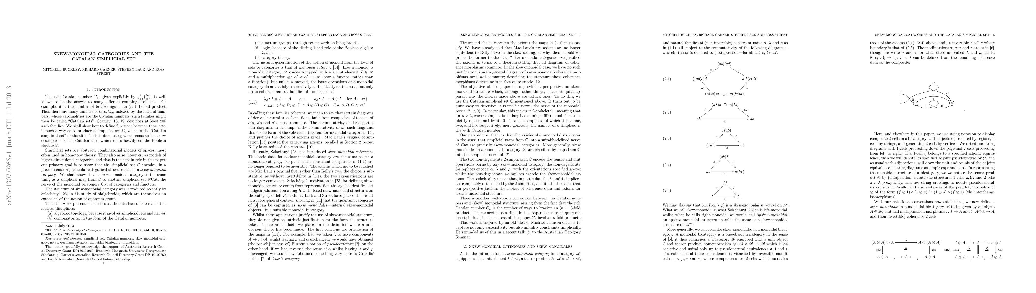 This paper explores the concept of skew-monoidal categories, presenting them as natural generalizations of monoidal categories with specific constraint orientations and Mac Lane's five axioms. It utilizes the Catalan simplicial set C to classify these structures, demonstrating that simplicial maps from C into the nerve of the category of categories precisely define skew-monoidal categories.