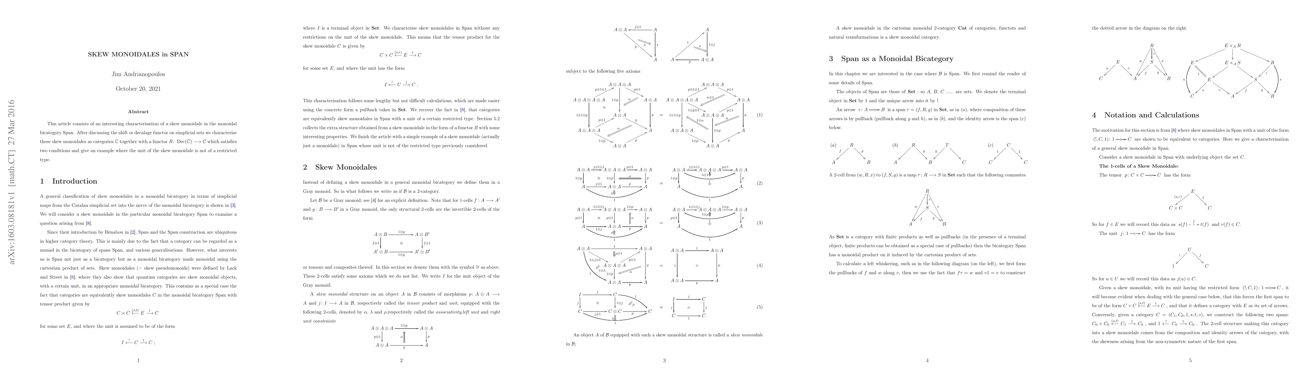This article consists of an interesting characterisation of a skew monoidale in the monoidal bicategory $Span$. After discussing the shift or decalage functor on simplicial sets we characterise these skew monoidales as categories $\mathbb C$ together with a functor $R \colon Dec(\mathbb C) \longrightarrow \mathbb C$ which satisfies two conditions and give an example where the unit of the skew monoidale is not of a restricted type.