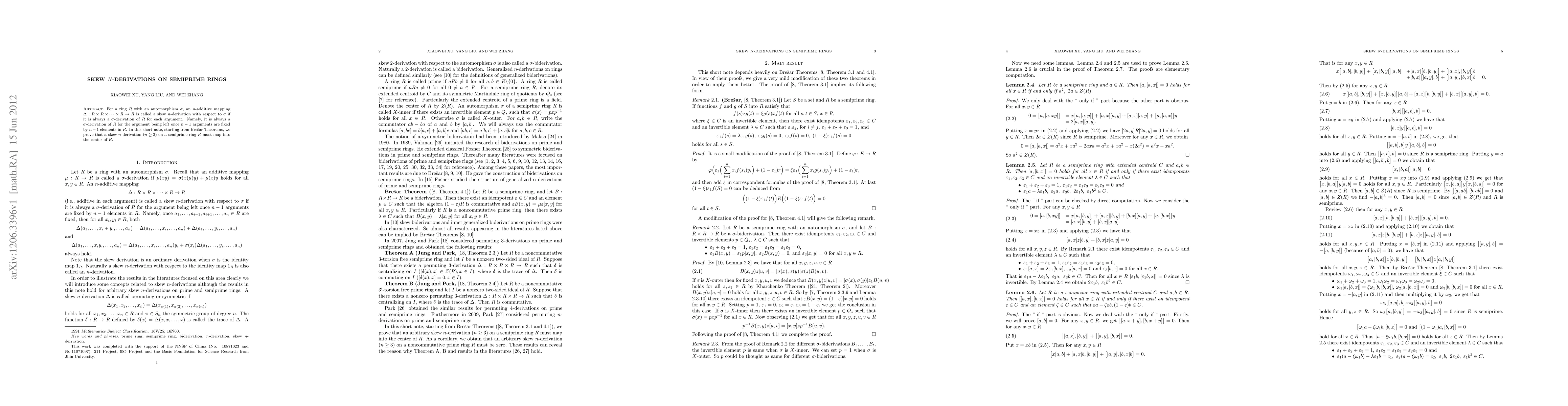 For a ring $R$ with an automorphism $\sigma$, an $n$-additive mapping $\Delta:R\times R\times... \times R \rightarrow R$ is called a skew $n$-derivation with respect to $\sigma$ if it is always a $\sigma$-derivation of $R$ for each argument. Namely, it is always a $\sigma$-derivation of $R$ for the argument being left once $n-1$ arguments are fixed by $n-1$ elements in $R$. In this short note, starting from Bre\v{s}ar Theorems, we prove that a skew $n$-derivation ($n\geq 3$) on a semiprime ring $R$ must map into the center of $R$.