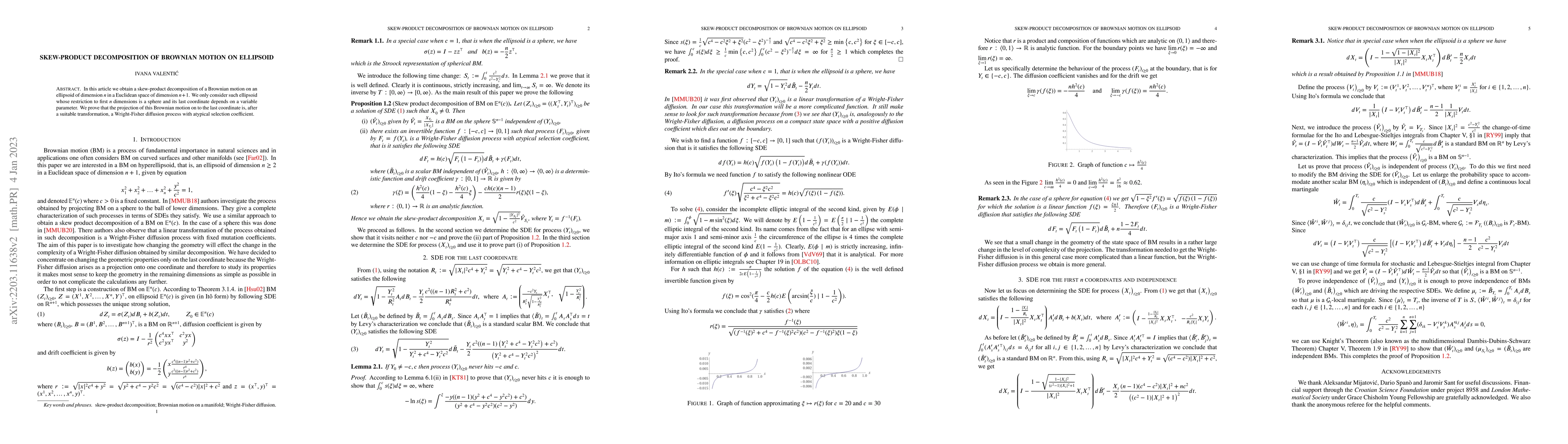 This paper presents a skew-product decomposition for Brownian motion on a special ellipsoid in an $(n+1)$-dimensional space, where the ellipsoid's projection onto the first $n$ dimensions is a sphere. The study reveals that the projection onto the last coordinate transforms into a Wright-Fisher diffusion process with a unique selection coefficient.