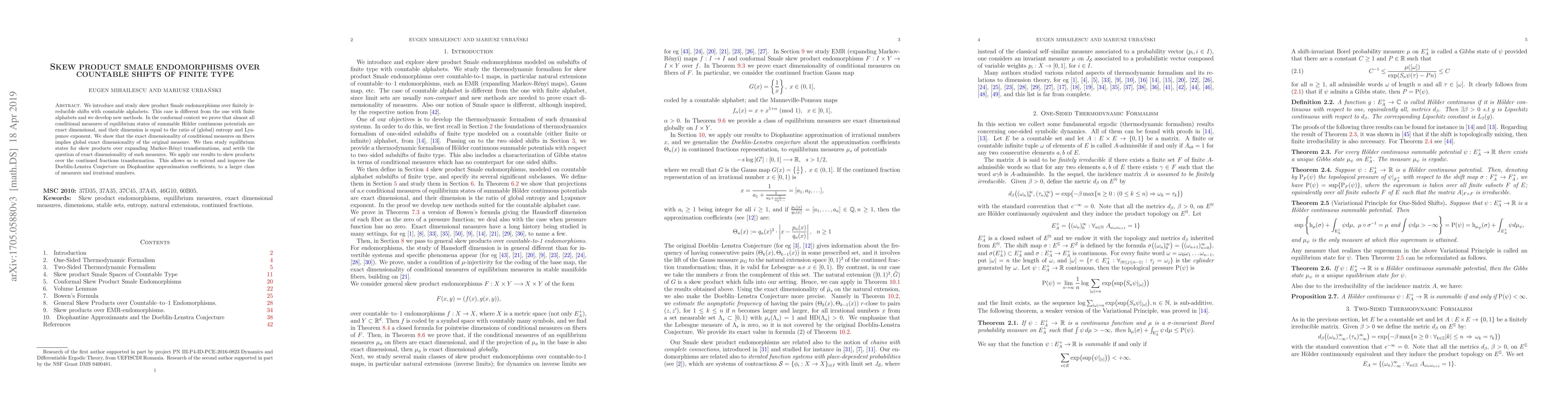 We introduce and study skew product Smale endomorphisms over finitely irreducible topological Markov shifts with countable alphabets. We prove that almost all conditional measures of equilibrium states of summable and locally Holder continuous potentials are dimensionally exact, and that their dimension is equal to the ratio of the (global) entropy and the Lyapunov exponent. We also prove for them a formula of Bowen type for the Hausdorff dimension of all fibers. We develop a version of thermodynamic formalism for finitely irreducible two-sided topological Markov shifts with countable alphabets. We describe then the thermodynamic formalism for Smale skew products over countable-to-1 endomorphisms, and give several applications to measures on natural extensions of endomorphisms. We show that the exact dimensionality of conditional measures on fibers, implies the global exact dimensionality of the measure, in certain cases. We then study equilibrium states for skew products over endomorphisms generated by graph directed Markov systems, in particular for skew products over expanding Markov-Renyi(EMR) maps, and we settle the question of the exact dimensionality of such measures. In particular, this applies to skew products over the continued fractions transformation, and over parabolic maps. We prove next two results related to Diophantine approximation, which make the renowned Doeblin-Lenstra Conjecture more general and more precise, for a different class of measures than in the classical case. In the end, we prove exact dimensionality and find a computable formula for the dimension of equilibrium measures, for induced maps of natural extensions $\mathcal T_\beta$ of beta-maps, for arbitrary \beta > 1.