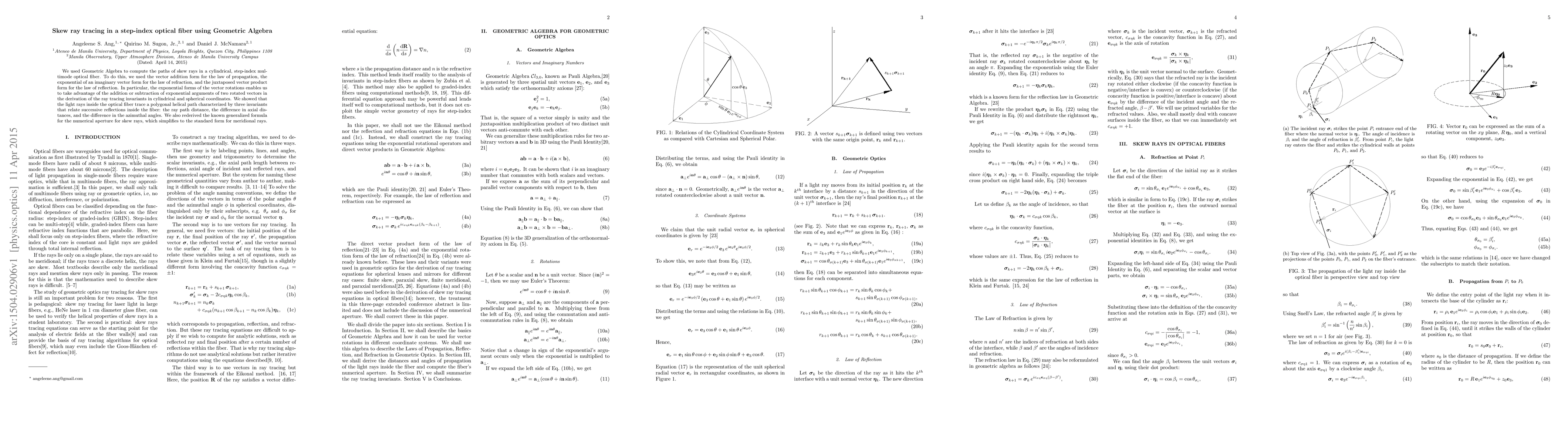This paper employs Geometric Algebra to trace skew rays in a step-index optical fiber, deriving polygonal helical paths using vector rotations and invariants. It also simplifies the generalized formula for the numerical aperture for skew rays, aligning with the standard form for meridional rays.