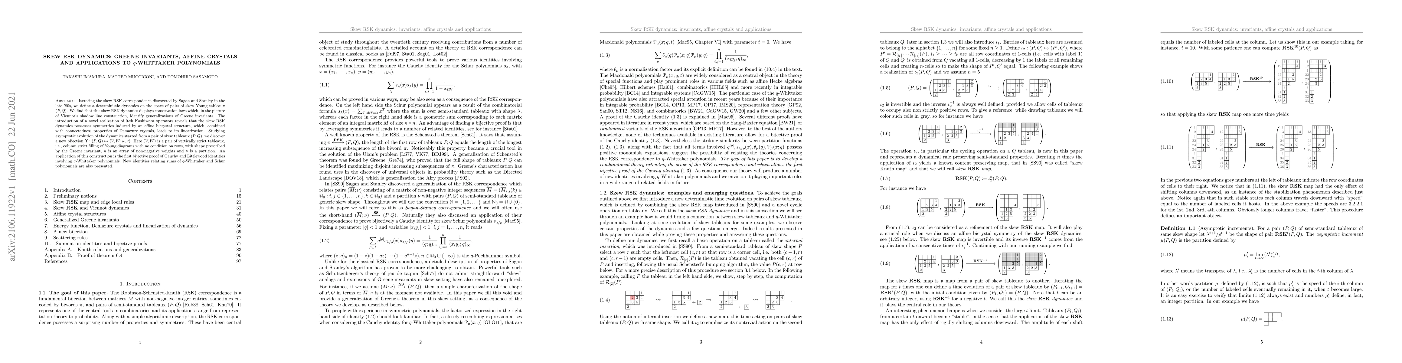 Iterating the skew RSK correspondence discovered by Sagan and Stanley in the late '80s, we define a deterministic dynamics on the space of pairs of skew Young tableaux $(P,Q)$. We find that this skew RSK dynamics displays conservation laws which, in the picture of Viennot's shadow line construction, identify generalizations of Greene invariants. The introduction of a novel realization of $0$-th Kashiwara operators reveals that the skew RSK dynamics possesses symmetries induced by an affine bicrystal structure, which, combined with connectedness properties of Demazure crystals, leads to its linearization. Studying asymptotic evolution of the dynamics started from a pair of skew tableaux $(P,Q)$, we discover a new bijection $\Upsilon : (P,Q) \mapsto (V,W; \kappa, \nu)$. Here $(V,W)$ is a pair of vertically strict tableaux, i.e., column strict filling of Young diagrams with no condition on rows, with shape prescribed by the Greene invariant, $\kappa$ is an array of non-negative weights and $\nu$ is a partition. An application of this construction is the first bijective proof of Cauchy and Littlewood identities involving $q$-Whittaker polynomials. New identities relating sums of $q$-Whittaker and Schur polynomials are also presented.