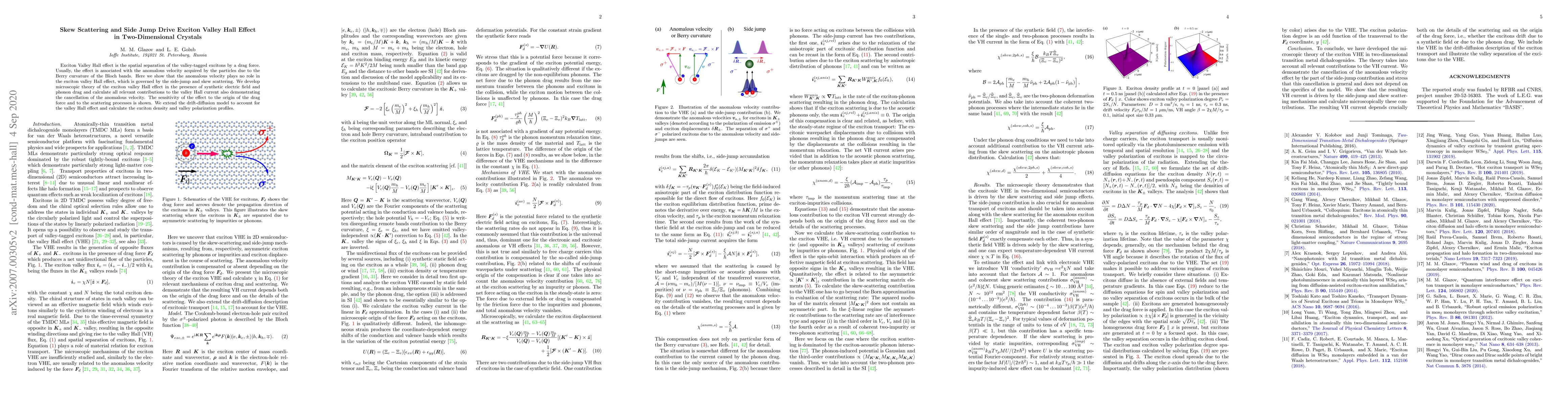 The paper proposes that the exciton valley Hall effect in two-dimensional crystals is driven by side-jump and skew scattering mechanisms rather than anomalous velocity due to Berry curvature. The authors develop a microscopic theory to calculate valley Hall current contributions and show the effect's sensitivity to drag force and scattering processes.