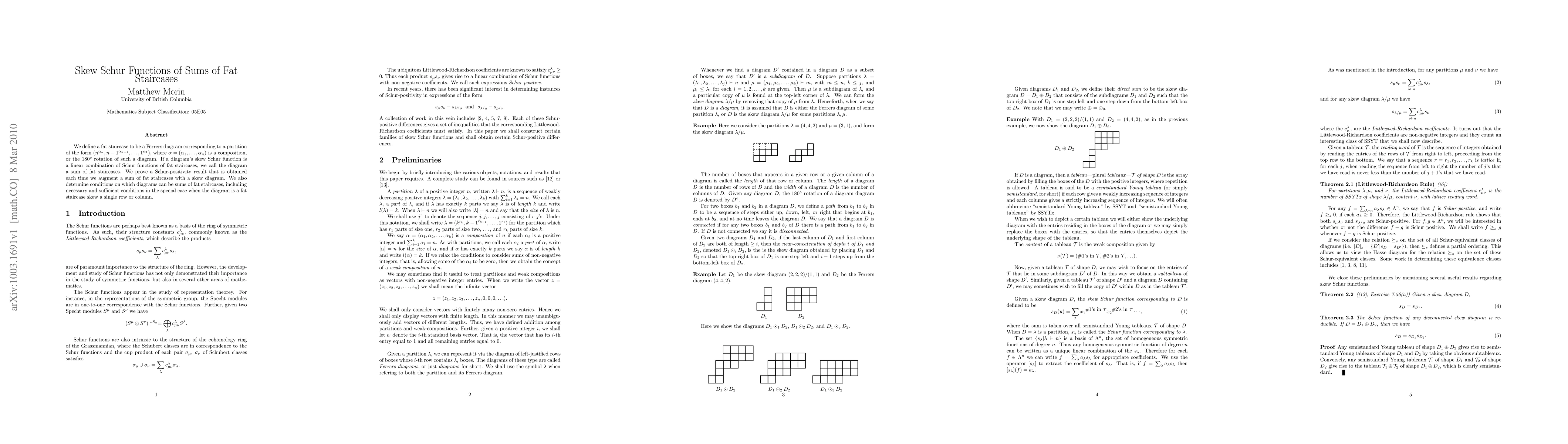 This paper defines fat staircases as Ferrers diagrams corresponding to specific partitions and explores skew Schur functions of sums of these diagrams. The authors prove Schur-positivity results for augmented sums of fat staircases and determine conditions under which certain diagrams can be expressed as such sums.