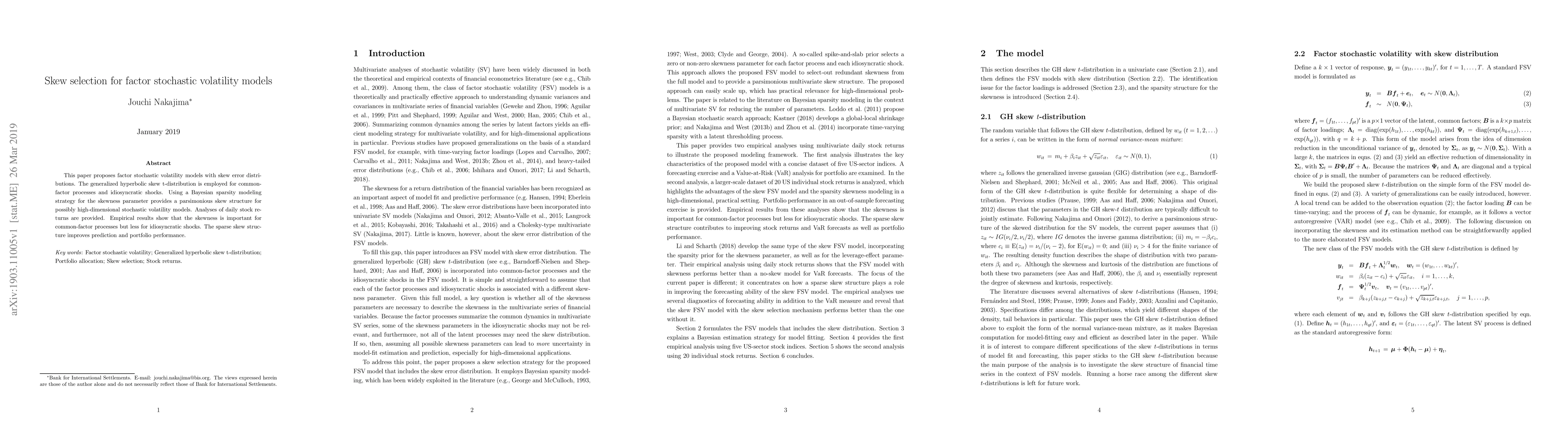 This paper proposes factor stochastic volatility models with skew error distributions. The generalized hyperbolic skew t-distribution is employed for common-factor processes and idiosyncratic shocks. Using a Bayesian sparsity modeling strategy for the skewness parameter provides a parsimonious skew structure for possibly high-dimensional stochastic volatility models. Analyses of daily stock returns are provided. Empirical results show that the skewness is important for common-factor processes but less for idiosyncratic shocks. The sparse skew structure improves prediction and portfolio performance.