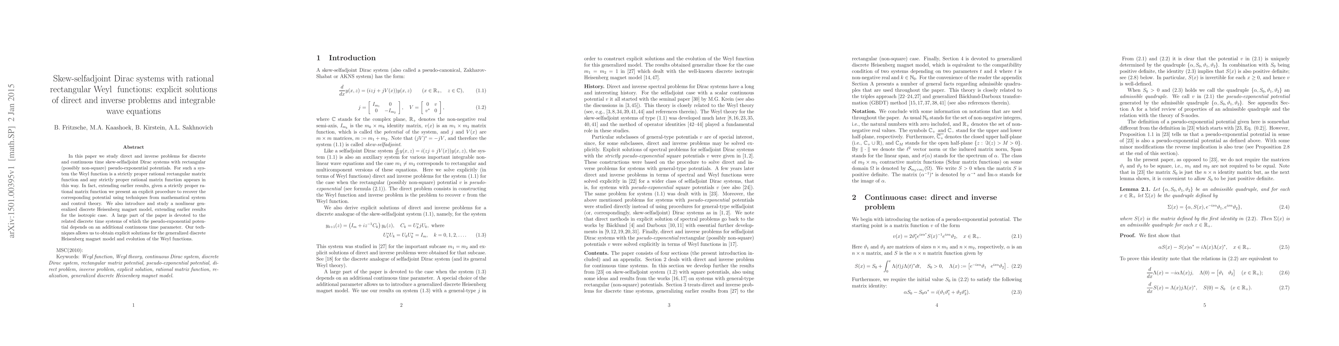 In this paper we study direct and inverse problems for discrete and continuous time skew-selfadjoint Dirac systems with rectangular (possibly non-square) pseudo-exponential potentials. For such a system the Weyl function is a strictly proper rational rectangular matrix function and any strictly proper rational matrix function appears in this way. In fact, extending earlier results, given a strictly proper rational matrix function we present an explicit procedure to recover the corresponding potential using techniques from mathematical system and control theory. We also introduce and study a nonlinear generalized discrete Heisenberg magnet model, extending earlier results for the isotropic case. A large part of the paper is devoted to the related discrete time systems of which the pseudo-exponential potential depends on an additional continuous time parameter. Our techniques allows us to obtain explicit solutions for the generalized discrete Heisenberg magnet model and evolution of the Weyl functions.