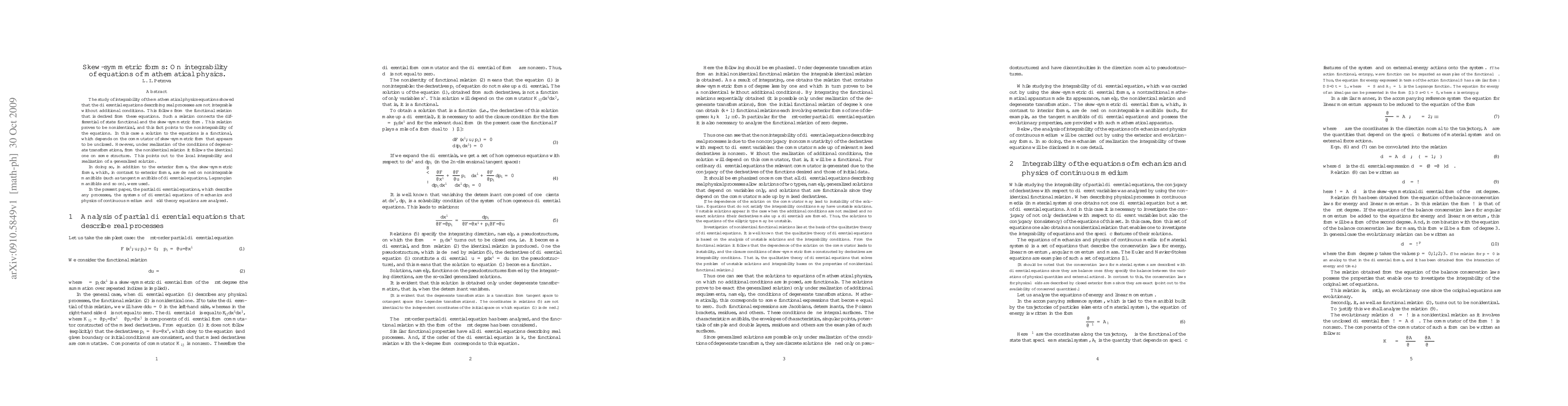 The study of integrability of the mathematical physics equations showed that the differential equations describing real processes are not integrable without additional conditions. This follows from the functional relation that is derived from these equations. Such a relation connects the differential of state functional and the skew-symmetric form. This relation proves to be nonidentical, and this fact points to the nonintegrability of the equations. In this case a solution to the equations is a functional, which depends on the commutator of skew-symmetric form that appears to be unclosed. However, under realization of the conditions of degenerate transformations, from the nonidentical relation it follows the identical one on some structure. This points out to the local integrability and realization of a generalized solution. In doing so, in addition to the exterior forms, the skew-symmetric forms, which, in contrast to exterior forms, are defined on nonintegrable manifolds (such as tangent manifolds of differential equations, Lagrangian manifolds and so on), were used. In the present paper, the partial differential equations, which describe any processes, the systems of differential equations of mechanics and physics of continuous medium and field theory equations are analyzed.