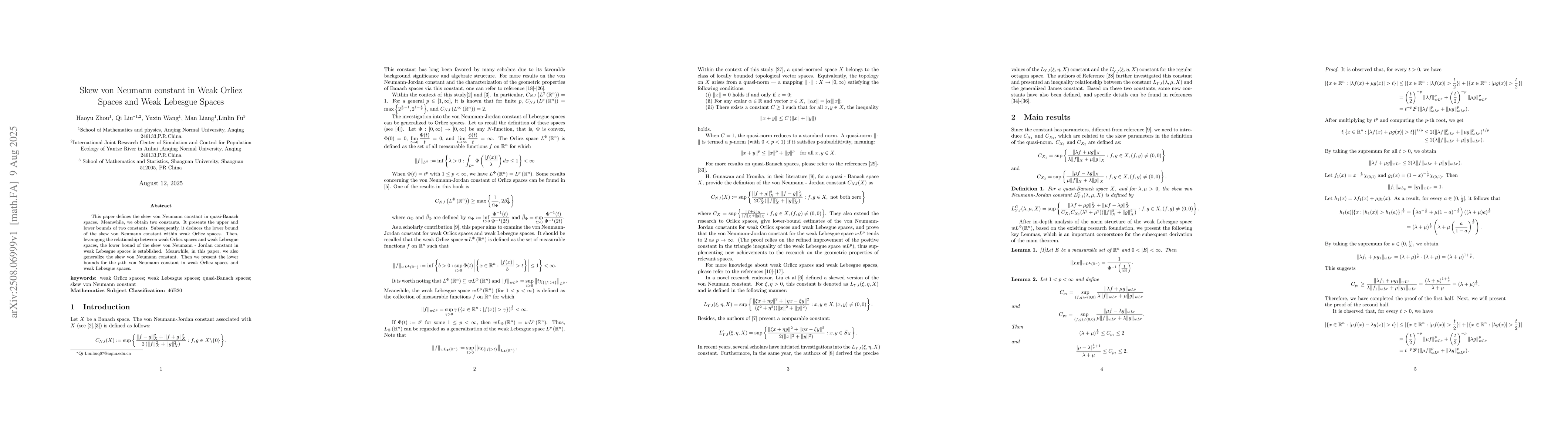 This paper defines the skew von Neumann constant in quasi-Banach spaces. Meanwhile, we obtain two constants. It presents the upper and lower bounds of two constants. Subsequently, it deduces the lower bound of the skew von Neumann constant within weak Orlicz spaces. Then, leveraging the relationship between weak Orlicz spaces and weak Lebesgue spaces, the lower bound of the skew von Neumann - Jordan constant in weak Lebesgue spaces is established. Meanwhile, in this paper, we also generalize the skew von Neumann constant. Then we present the lower bounds for the $p$-th von Neumann constant in weak Orlicz spaces and weak Lebesgue spaces.