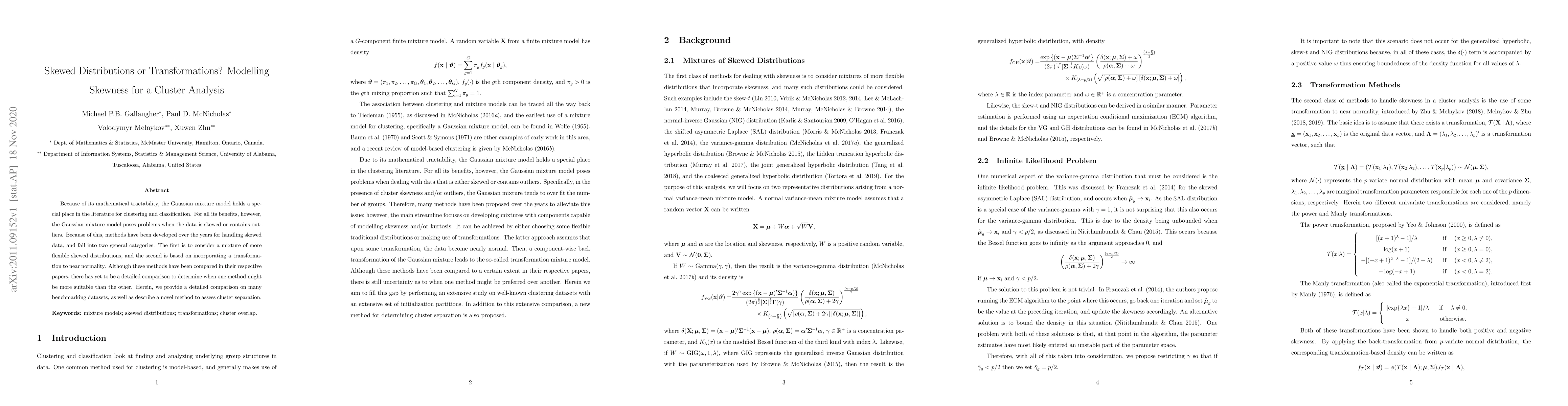 This paper compares two approaches for handling skewed data in Gaussian mixture models: using skewed distributions and applying transformations to near normality. It provides a detailed evaluation across multiple datasets and introduces a new method to assess cluster separation.
