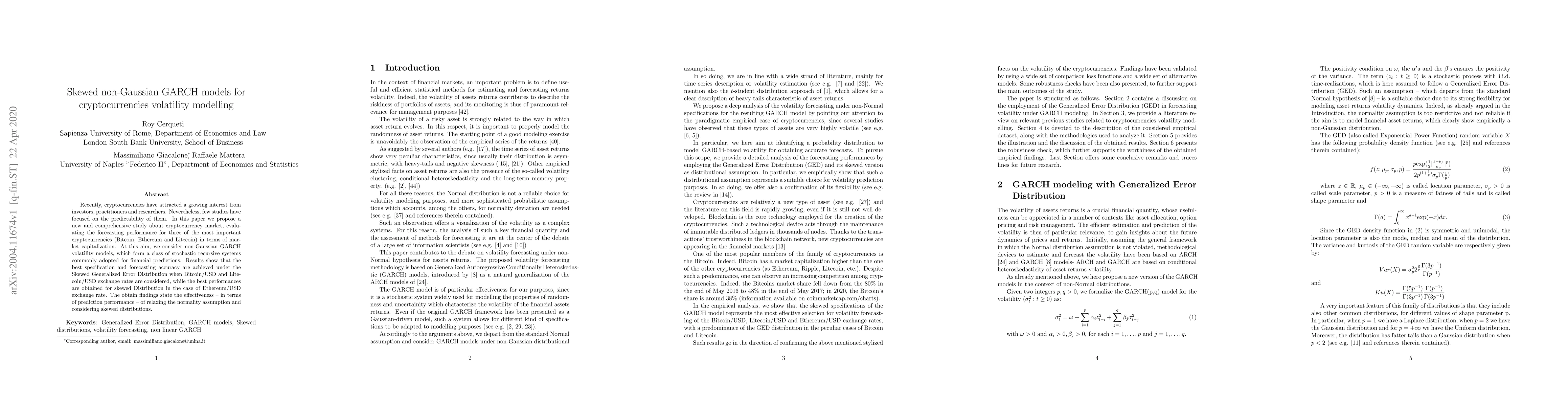Recently, cryptocurrencies have attracted a growing interest from investors, practitioners and researchers. Nevertheless, few studies have focused on the predictability of them. In this paper we propose a new and comprehensive study about cryptocurrency market, evaluating the forecasting performance for three of the most important cryptocurrencies (Bitcoin, Ethereum and Litecoin) in terms of market capitalization. At this aim, we consider non-Gaussian GARCH volatility models, which form a class of stochastic recursive systems commonly adopted for financial predictions. Results show that the best specification and forecasting accuracy are achieved under the Skewed Generalized Error Distribution when Bitcoin/USD and Litecoin/USD exchange rates are considered, while the best performances are obtained for skewed Distribution in the case of Ethereum/USD exchange rate. The obtain findings state the effectiveness -- in terms of prediction performance -- of relaxing the normality assumption and considering skewed distributions.