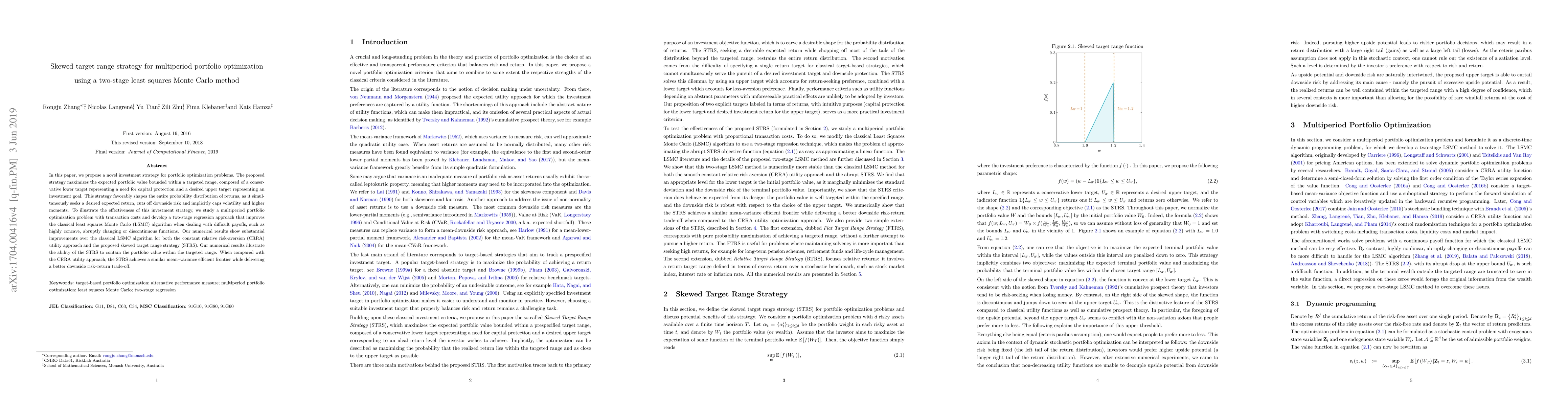 This paper introduces a skewed target range strategy for multiperiod portfolio optimization, which maximizes expected portfolio value within a defined range while managing risk. The authors develop a two-stage least squares Monte Carlo method to improve classical LSMC, showing better performance in handling complex payoffs and achieving a favorable downside risk-return trade-off compared to the CRRA utility approach.