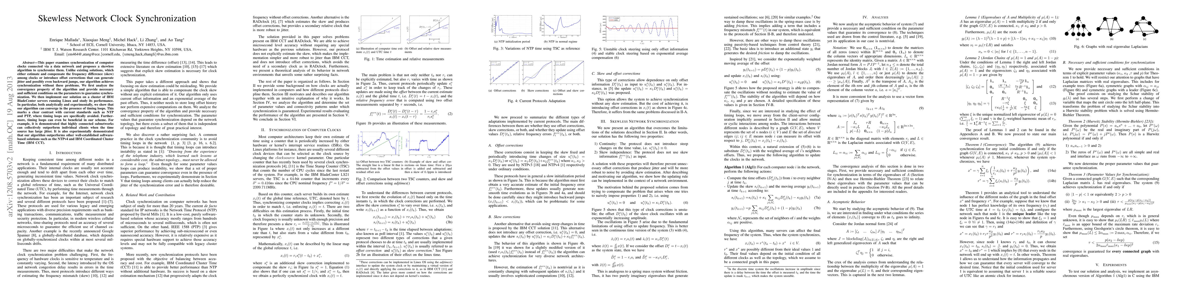 This paper examines synchronization of computer clocks connected via a data network and proposes a skewless algorithm to synchronize them. Unlike existing solutions, which either estimate and compensate the frequency difference (skew) among clocks or introduce offset corrections that can generate jitter and possibly even backward jumps, our algorithm achieves synchronization without these problems. We first analyze the convergence property of the algorithm and provide necessary and sufficient conditions on the parameters to guarantee synchronization. We then implement our solution on a cluster of IBM BladeCenter servers running Linux and study its performance. In particular, both analytically and experimentally, we show that our algorithm can converge in the presence of timing loops. This marks a clear contrast with current standards such as NTP and PTP, where timing loops are specifically avoided. Furthermore, timing loops can even be beneficial in our scheme. For example, it is demonstrated that highly connected subnetworks can collectively outperform individual clients when the time source has large jitter. It is also experimentally demonstrated that our algorithm outperforms other well-established software-based solutions such as the NTPv4 and IBM Coordinated Cluster Time (IBM CCT).