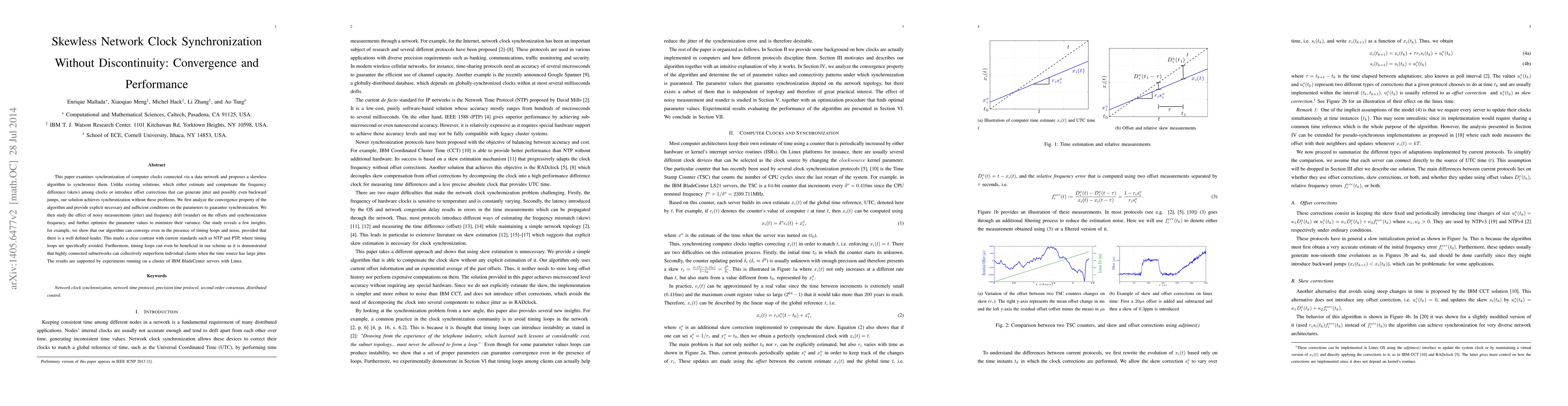 This paper examines synchronization of computer clocks connected via a data network and proposes a skewless algorithm to synchronize them. Unlike existing solutions, which either estimate and compensate the frequency difference (skew) among clocks or introduce offset corrections that can generate jitter and possibly even backward jumps, our solution achieves synchronization without these problems. We first analyze the convergence property of the algorithm and provide explicit necessary and sufficient conditions on the parameters to guarantee synchronization. We then study the effect of noisy measurements (jitter) and frequency drift (wander) on the offsets and synchronization frequency, and further optimize the parameter values to minimize their variance. Our study reveals a few insights, for example, we show that our algorithm can converge even in the presence of timing loops and noise, provided that there is a well defined leader. This marks a clear contrast with current standards such as NTP and PTP, where timing loops are specifically avoided. Furthermore, timing loops can even be beneficial in our scheme as it is demonstrated that highly connected subnetworks can collectively outperform individual clients when the time source has large jitter. The results are supported by experiments running on a cluster of IBM BladeCenter servers with Linux.