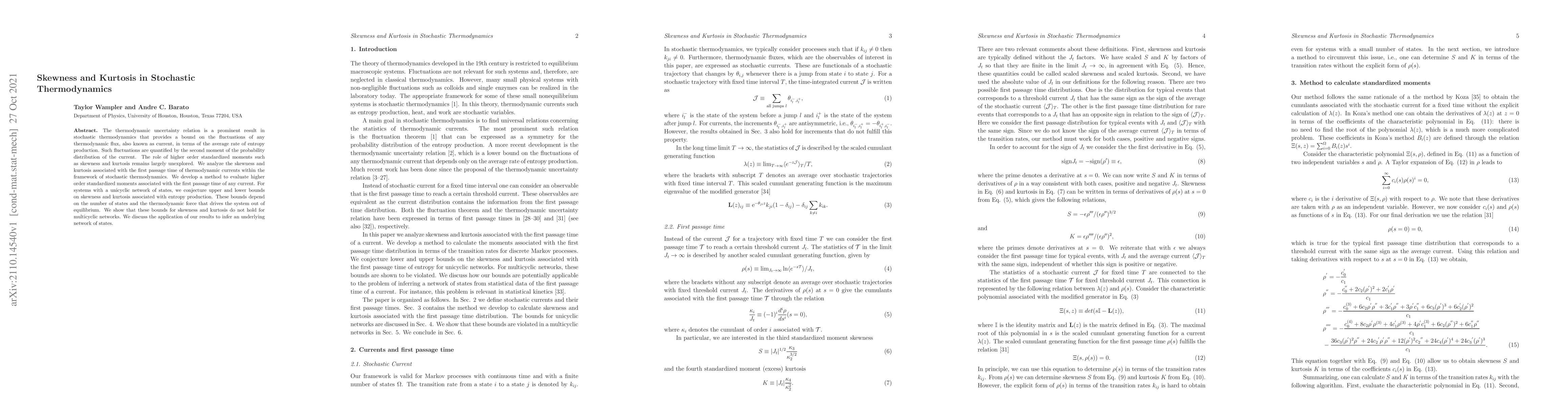 This paper explores the higher-order statistical moments, skewness and kurtosis, in stochastic thermodynamics, focusing on the first passage time of thermodynamic currents. It develops methods to evaluate these moments and provides bounds for unicyclic networks, which do not hold for multicyclic networks, suggesting implications for inferring underlying state networks.