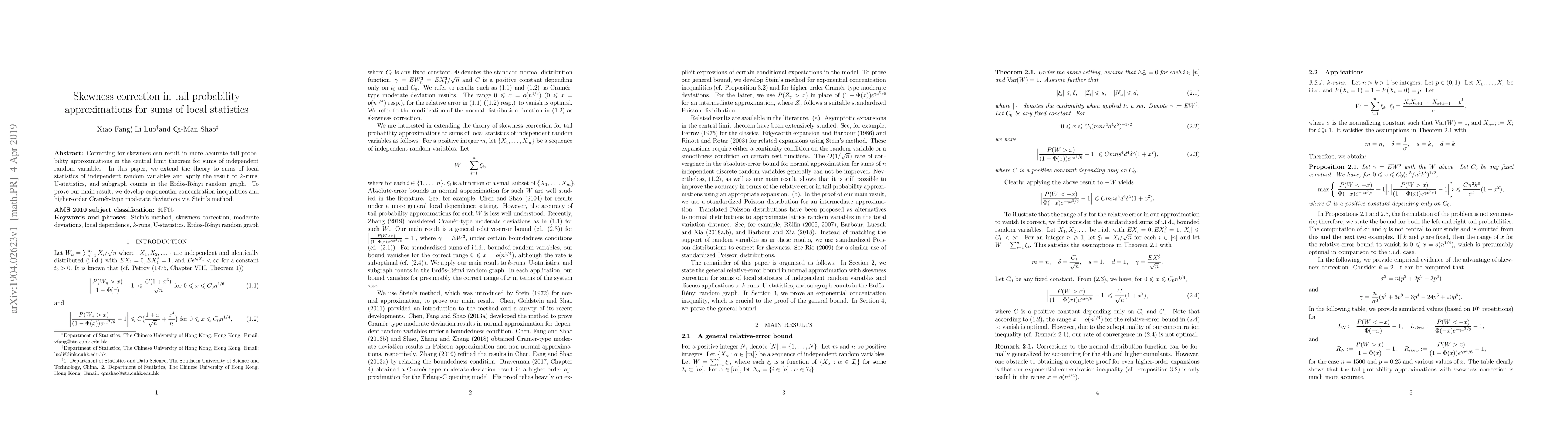 Correcting for skewness can result in more accurate tail probability approximations in the central limit theorem for sums of independent random variables. In this paper, we extend the theory to sums of local statistics of independent random variables and apply the result to $k$-runs, U-statistics, and subgraph counts in the Erd\"os-R\'enyi random graph. To prove our main result, we develop exponential concentration inequalities and higher-order Cram\'er-type moderate deviations via Stein's method.