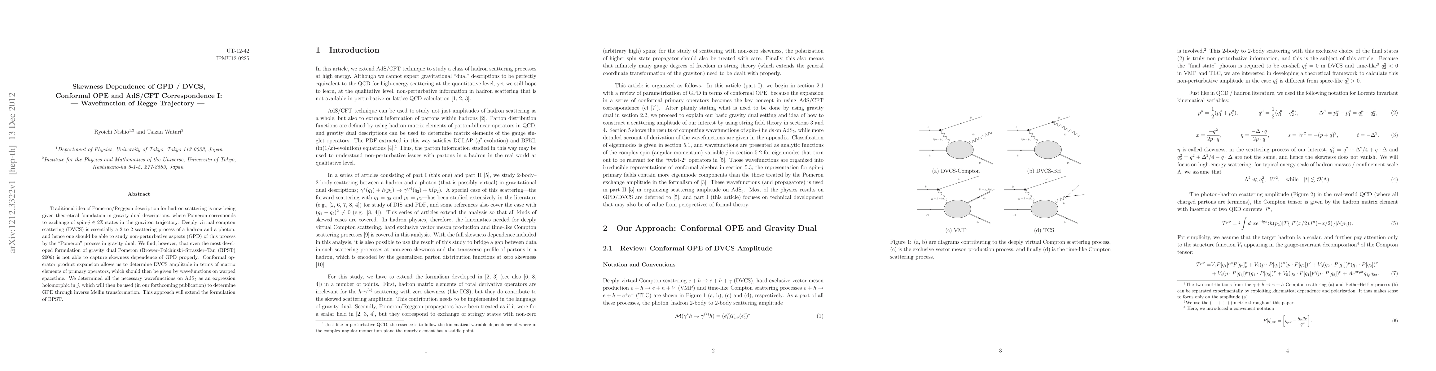 Traditional idea of Pomeron/Reggeon description for hadron scattering is now being given theoretical foundation in gravity dual descriptions, where Pomeron corresponds to exchange of spin-j\in 2Z states in the graviton trajectory. Deeply virtual compton scattering (DVCS) is essentially a 2 to 2 scattering process of a hadron and a photon, and hence one should be able to study non-perturbative aspects (GPD) of this process by the "Pomeron" process in gravity dual. We find, however, that even the most developed formulation of gravity dual Pomeron (Brower--Polchinski--Strassler--Tan (BPST) 2006) is not able to capture skewness dependence of GPD properly. Conformal operator product expansion allows us to determine DVCS amplitude in terms of matrix elements of primary operators, which should then be given by wavefunctions on warped spacetime. We determined all the necessary wavefunctions on AdS$_5$ as an expression holomorphic in $j$, which will then be used (in our forthcoming publication) to determine GPD through inverse Mellin transformation. This approach will extend the formulation of BPST.